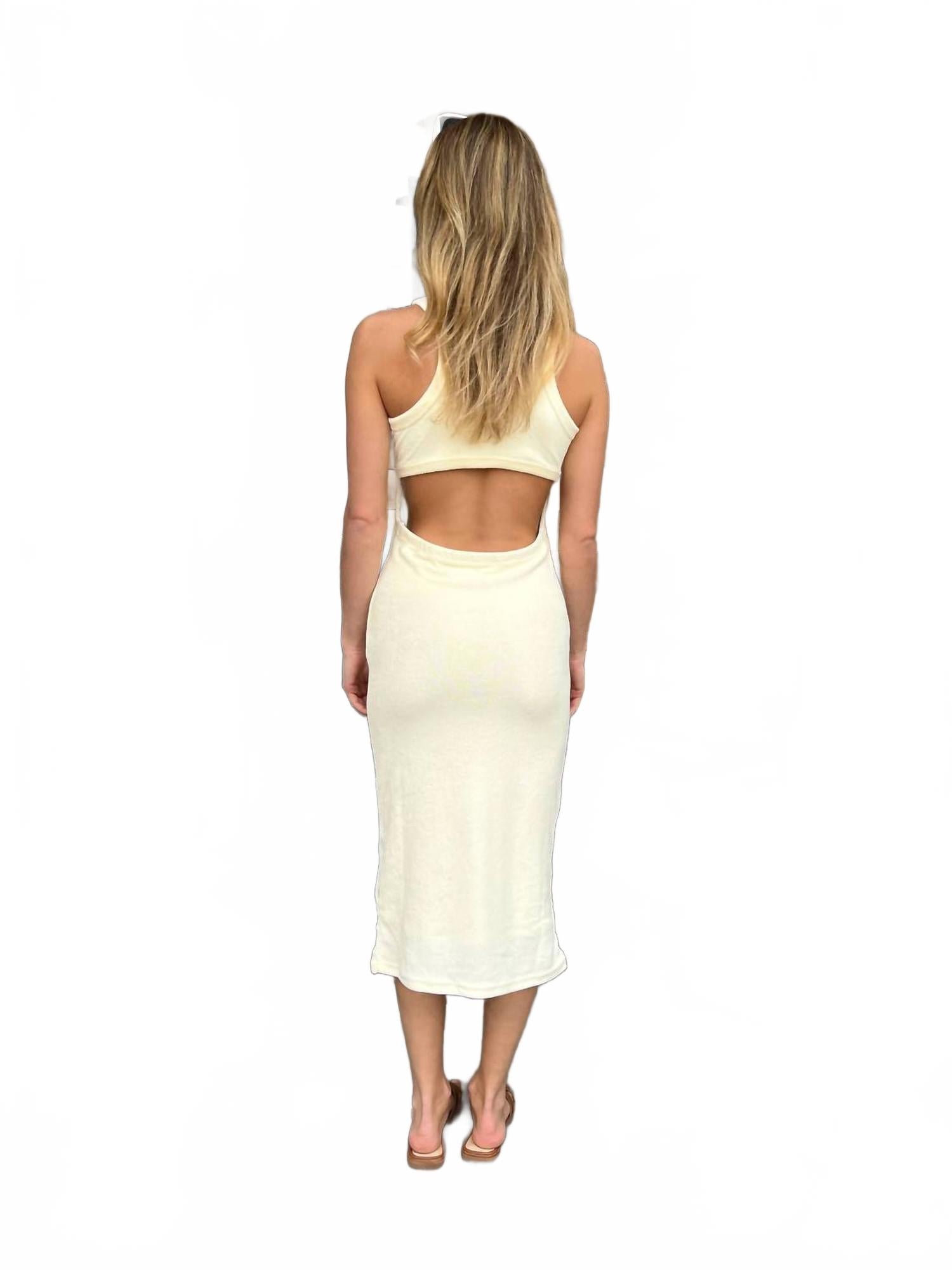 Ощутите непринужденную элегантность в платье Araminta James La Mer Cut Out Dress в шикарном оттенке безе, идеально подходящем для минималистичного весеннего образа. Это мини-платье без рукавов из 100% хлопка отличается облегающим силуэтом, изысканным высоким воротом и круглым вырезом, а также очаровательной открытой спиной. Удобная застежка-липучка добавляет ему очарования, идеально подходящего для отпуска.
