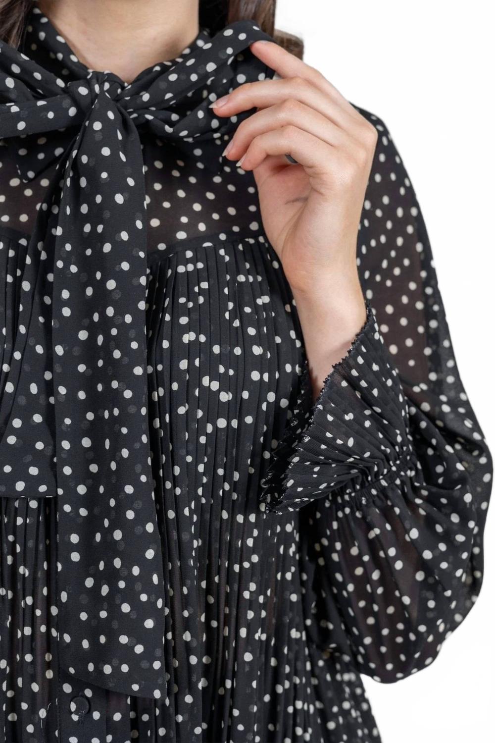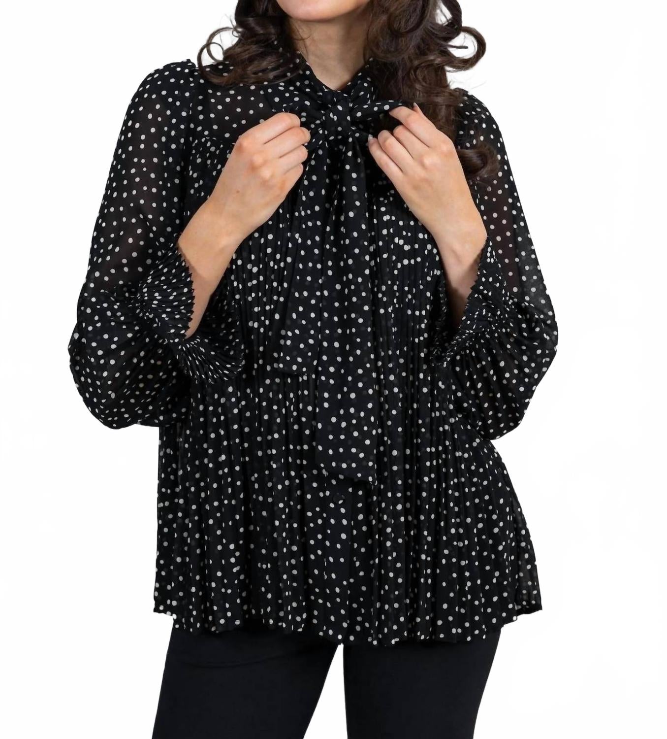 Универсальная блузка, которая подойдет как для работы, так и для ужина! Блузка Louka от Suncoo предлагает современную интерпретацию классического горошка с очаровательными узорами на четком черном фоне. Эта блузка с длинными рукавами изготовлена ​​из 100% полиэстера, что обеспечивает элегантную драпировку и удобную посадку. Она воплощает в себе рабочий шик, а гармошкообразные складки добавляют текстуру и подвижность. Рекомендации по уходу: деликатная стирка или обычная химчистка для легкого ухода.