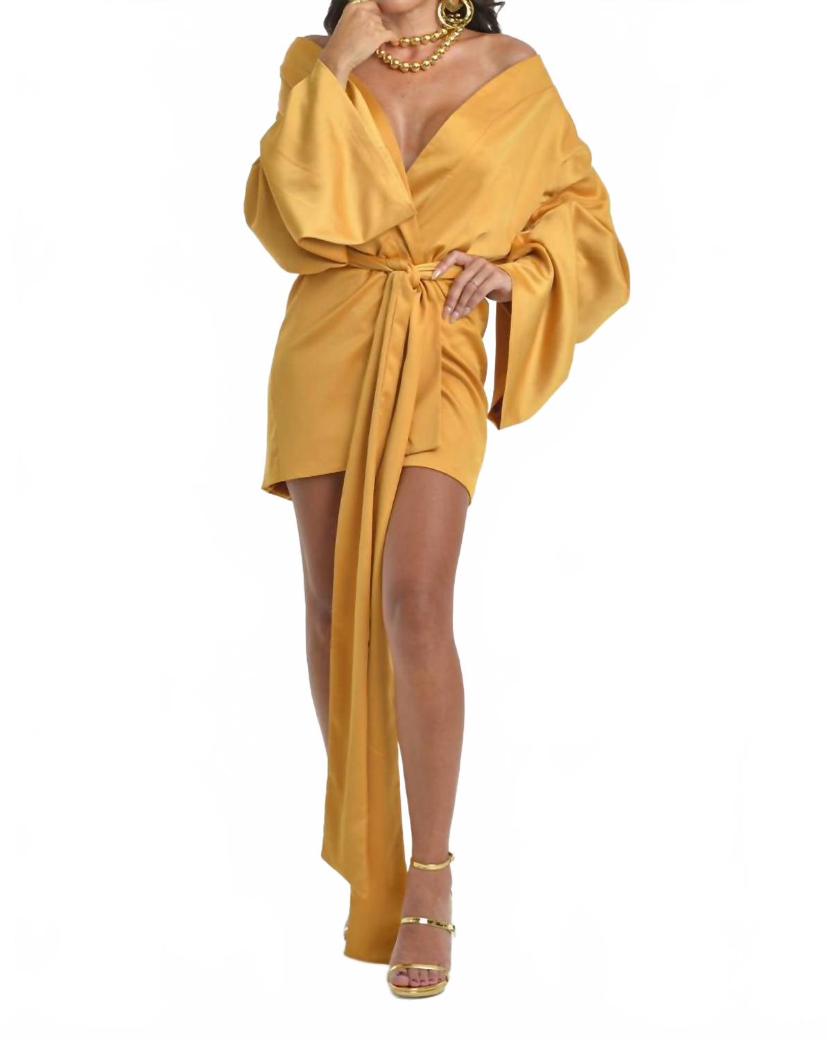 Идеальное платье с длинными рукавами для прохладных месяцев. Насладитесь роскошным очарованием платья-халат Golden Empress от Steffany Milano. Изготовленное из роскошного атласа и шелка, это платье отличается элегантными длинными рукавами и изысканным силуэтом-халатом. Глубокий V-образный вырез и завязка на талии создают изящную посадку, идеально подходящую для любого изысканного вечера. Цвет - желтый. Это платье идеально подходит для осенних случаев, воплощая сдержанную роскошь и однотонный узор.