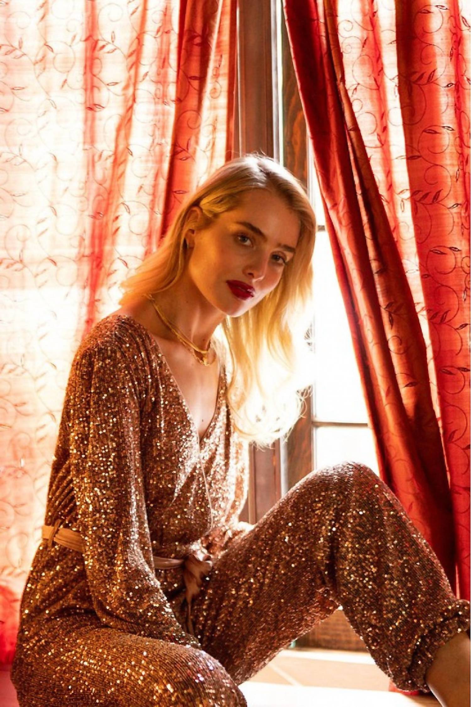 Комбинезон GEEGEE с пайетками насыщенного бронзового цвета идеально подходит для создания яркого образа. Эта женская модель с длинными рукавами и игривым V-образным вырезом гармонично сочетает в себе комфорт и стиль. Завязка на талии обеспечивает свободный крой и прямой силуэт. Застежка: надевайте.
