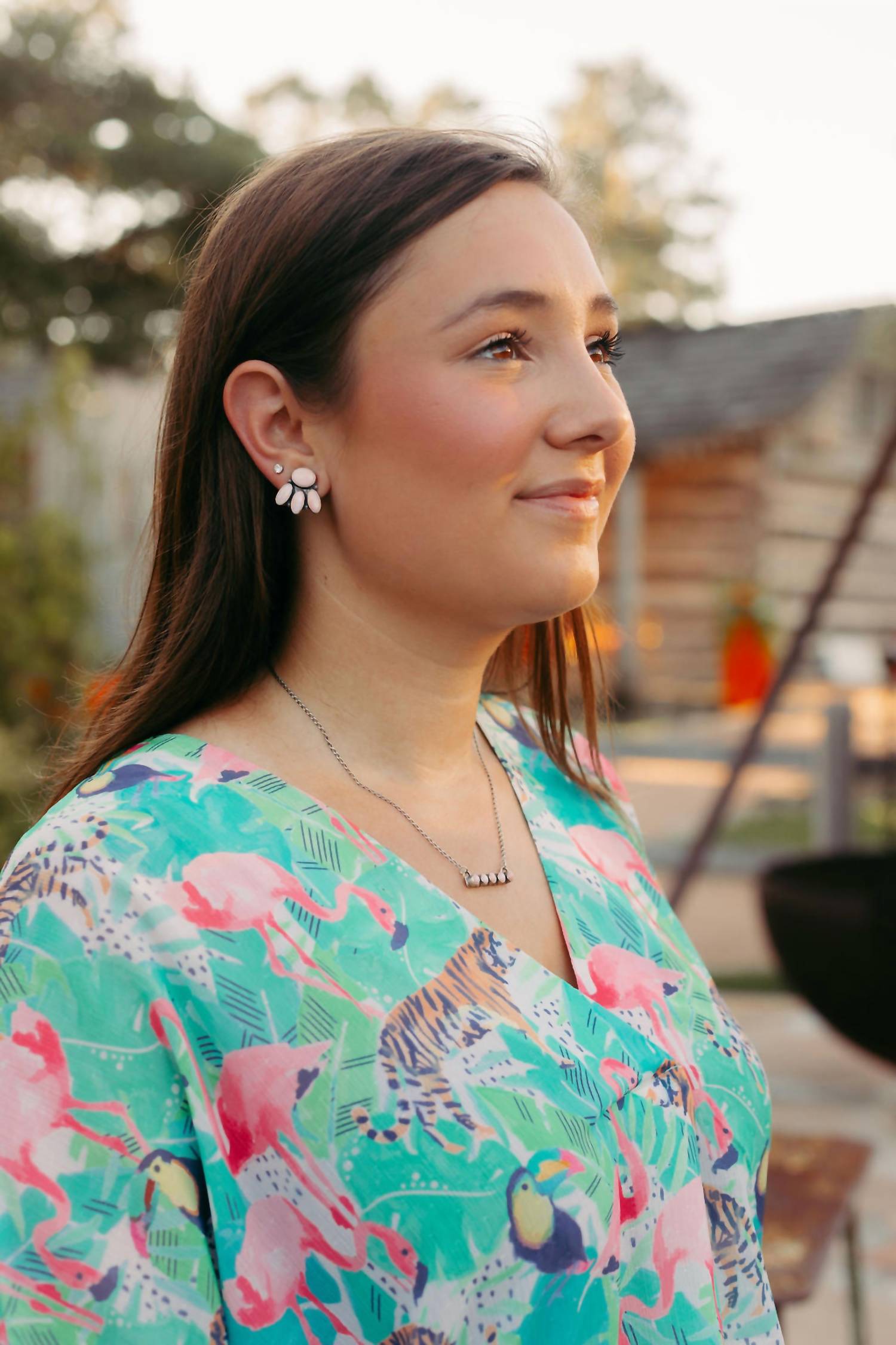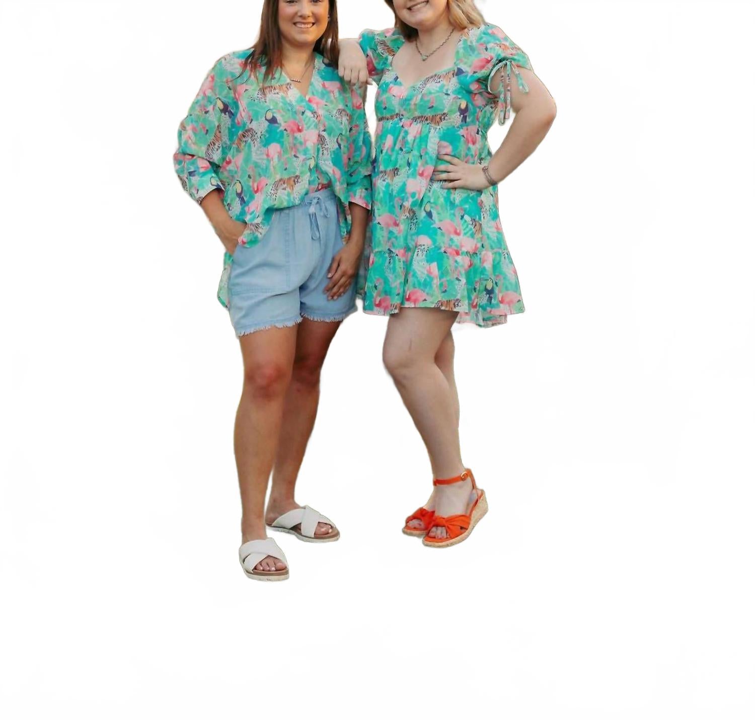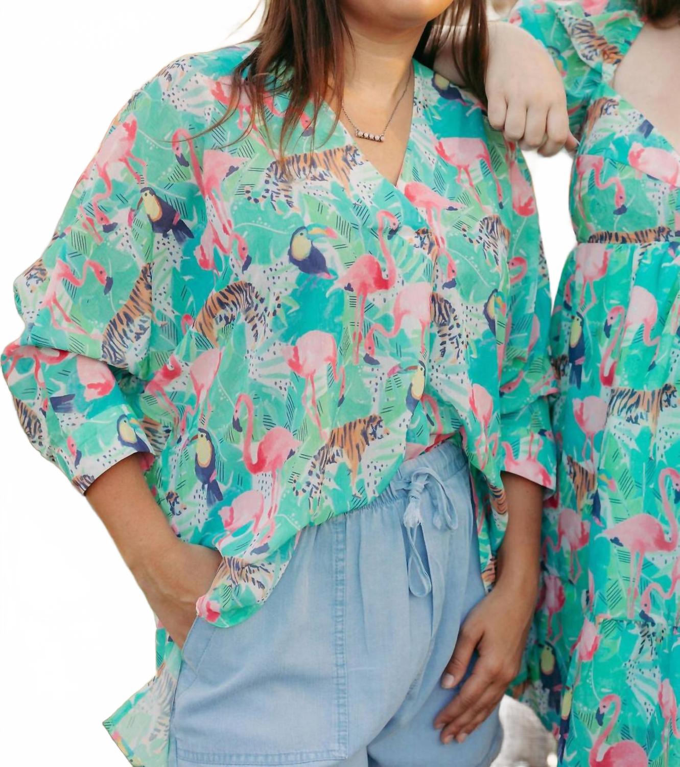 Универсальная блузка, которая подойдет и для работы, и для ужина! Представляем топ Flamingo Jungle от Sincerely Ours - бирюзовую блузку, которая добавит нотку бохо-шика вашему летнему гардеробу. Эта женская блузка с модным V-образным вырезом и эффектным анималистичным рисунком дополнена рукавами три четверти для дополнительной элегантности. Застежка: пуговицы. Уход: ручная стирка, сушить на горизонтальной поверхности. Идеально подходит для пляжного отдыха или в качестве подарка на День матери.