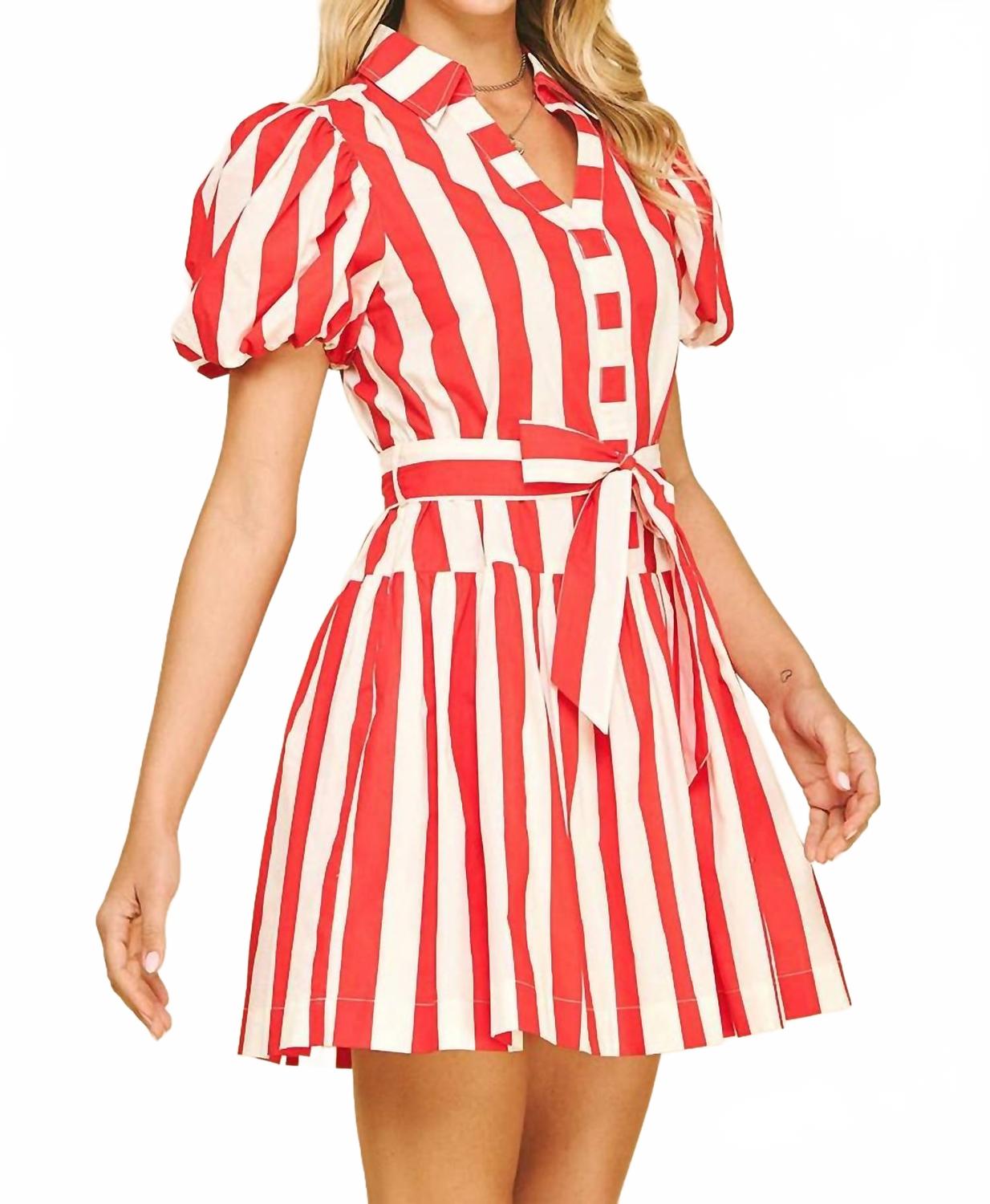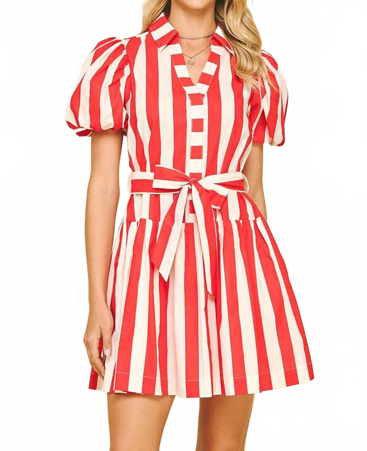Короткое и воздушное платье для теплых дней. Представляем мини-платье в полоску от PINCH - стильный и удобный вариант для вашего гардероба. Платье с короткими рукавами-фонариками и завязывающимся поясом на талии. Изготовленное из хлопка, оно обеспечивает воздухопроницаемость и имеет элегантный А-образный силуэт с классическим воротником. Это красное платье идеально подходит для праздничных вечеринок и других торжественных случаев. Оно имеет практичные боковые карманы и длину 88 см (размер S).