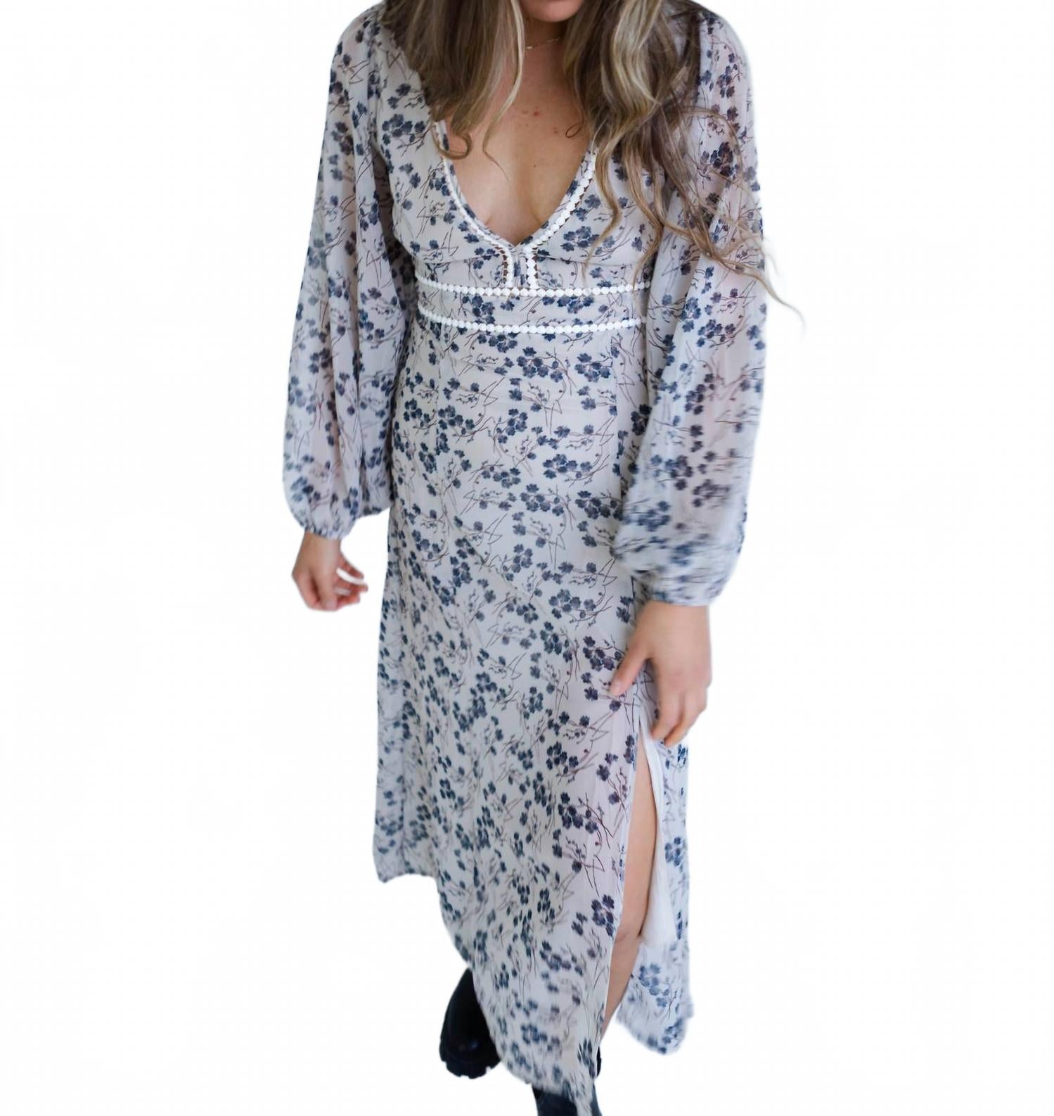 Просто добавьте шлепанцы или мюли, и все готово. Представляем женское платье миди с длинными рукавами от Wildflower - элегантная модель с пленительным синим цветочным узором. Это платье с длинными рукавами и V-образным вырезом идеально подходит для летних отпускных тенденций в уличном стиле. А-образный силуэт с застежкой на липучке дополнен кокетливым разрезом, который придает образу еще больше соблазнительности. Обратите внимание: для свободного кроя рекомендуется выбирать на размер больше.