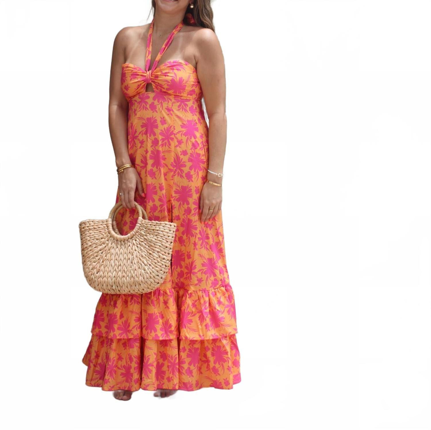 Идеальный выбор для солнечного пляжного дня или девичника. Платье в стиле бохо-шик с американской проймой и ярким цветочным узором привлекательного оранжевого цвета. Без рукавов и завышенная талия обеспечивают свободный крой и фиксируются удобными завязками. Стирайте это великолепное изделие вручную, чтобы сохранить его красоту. Рост модели: 178 см, грудь: 88 см, талия: 78 см, размер: M.