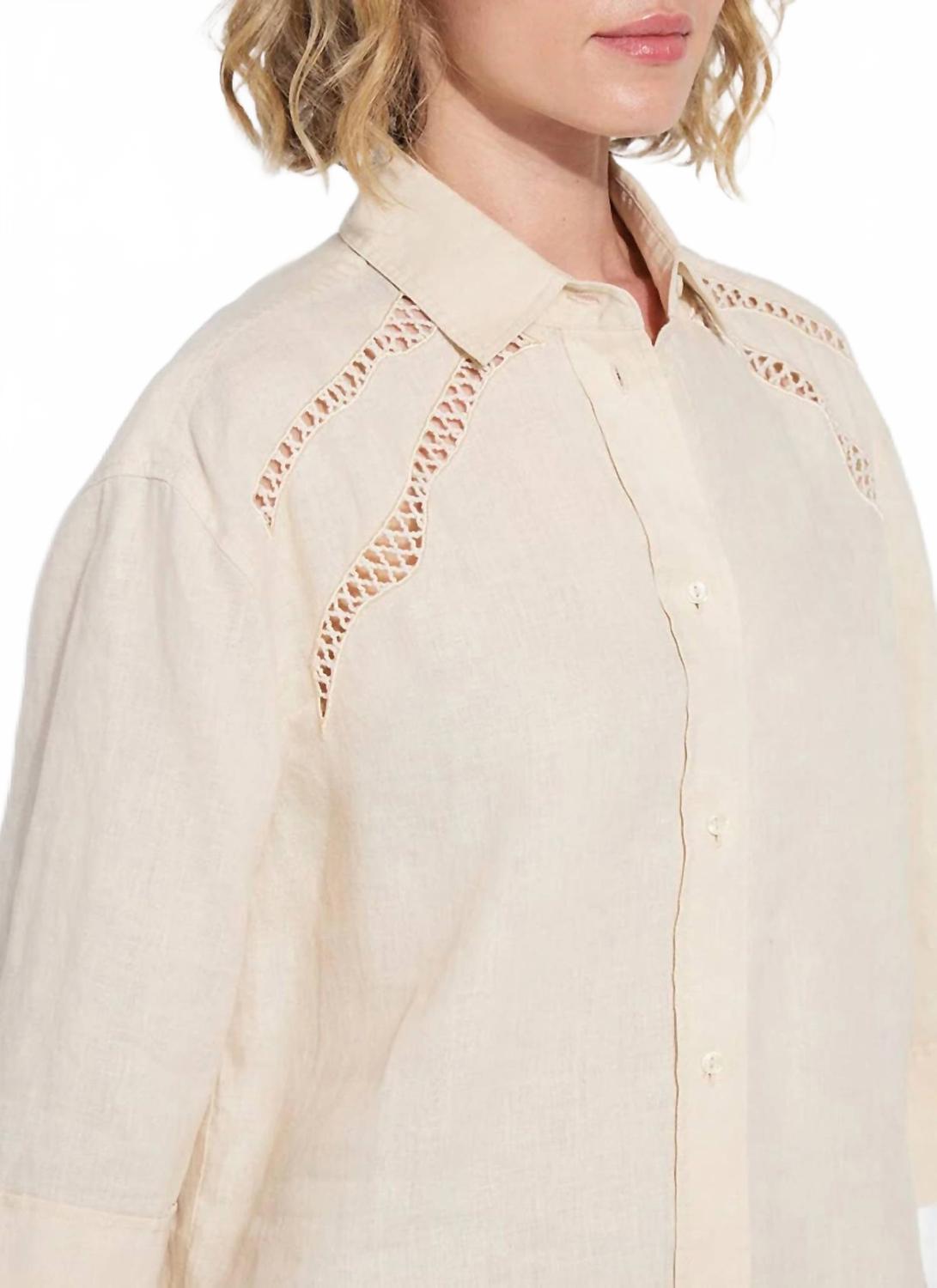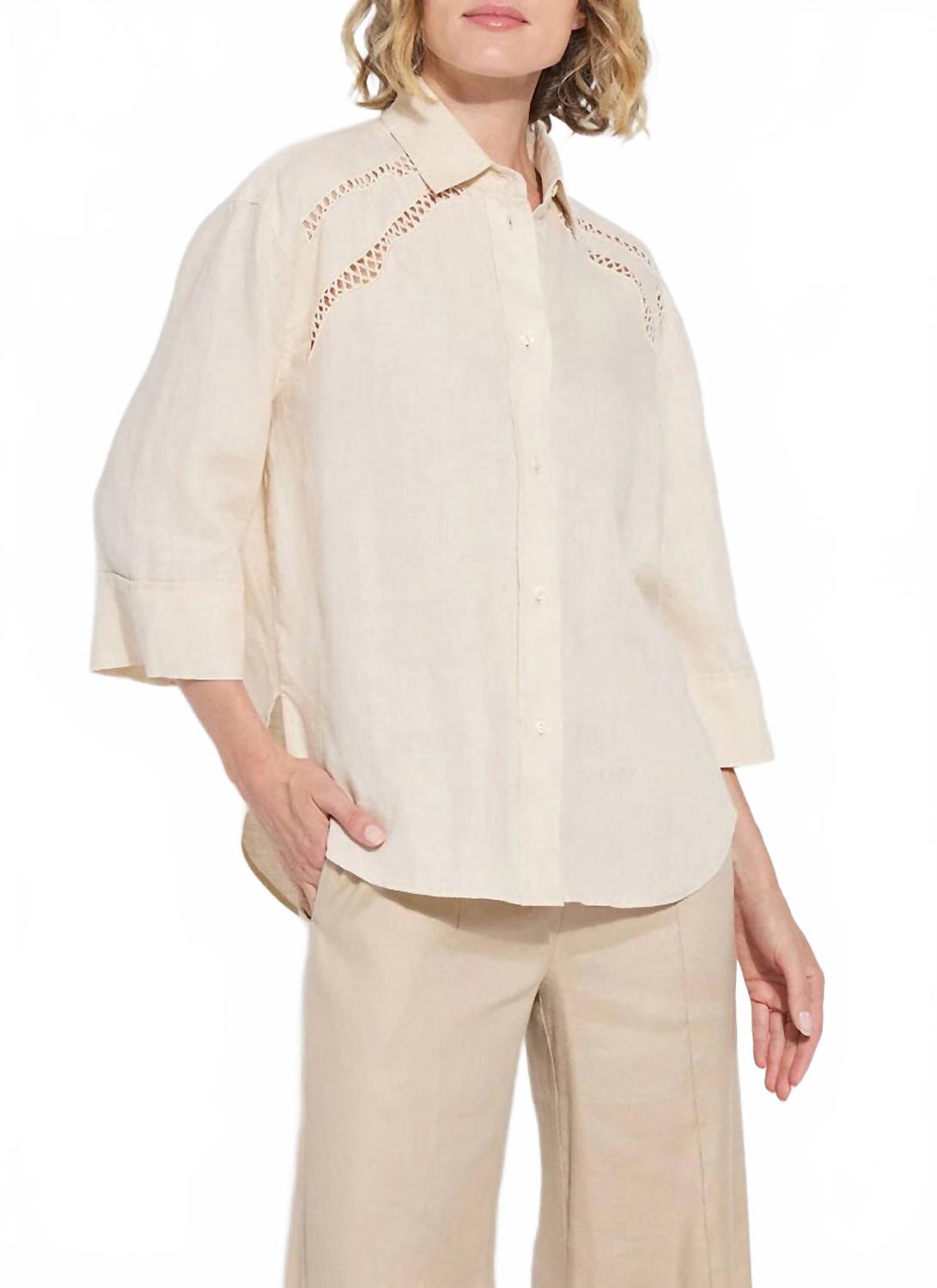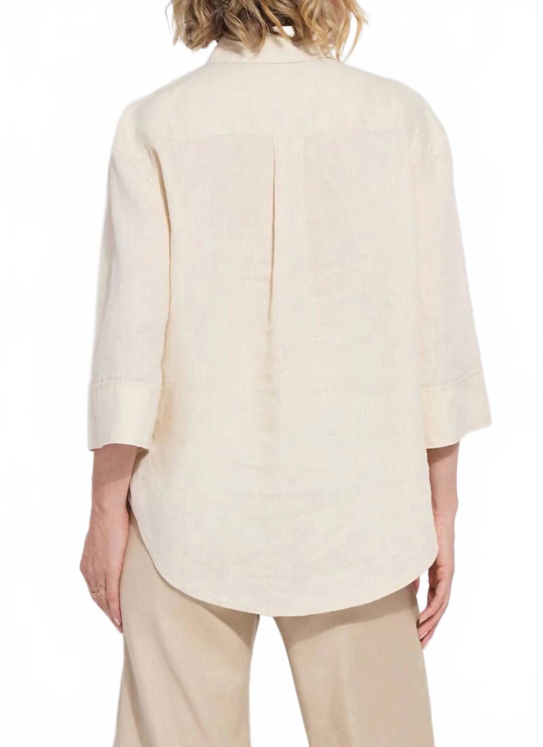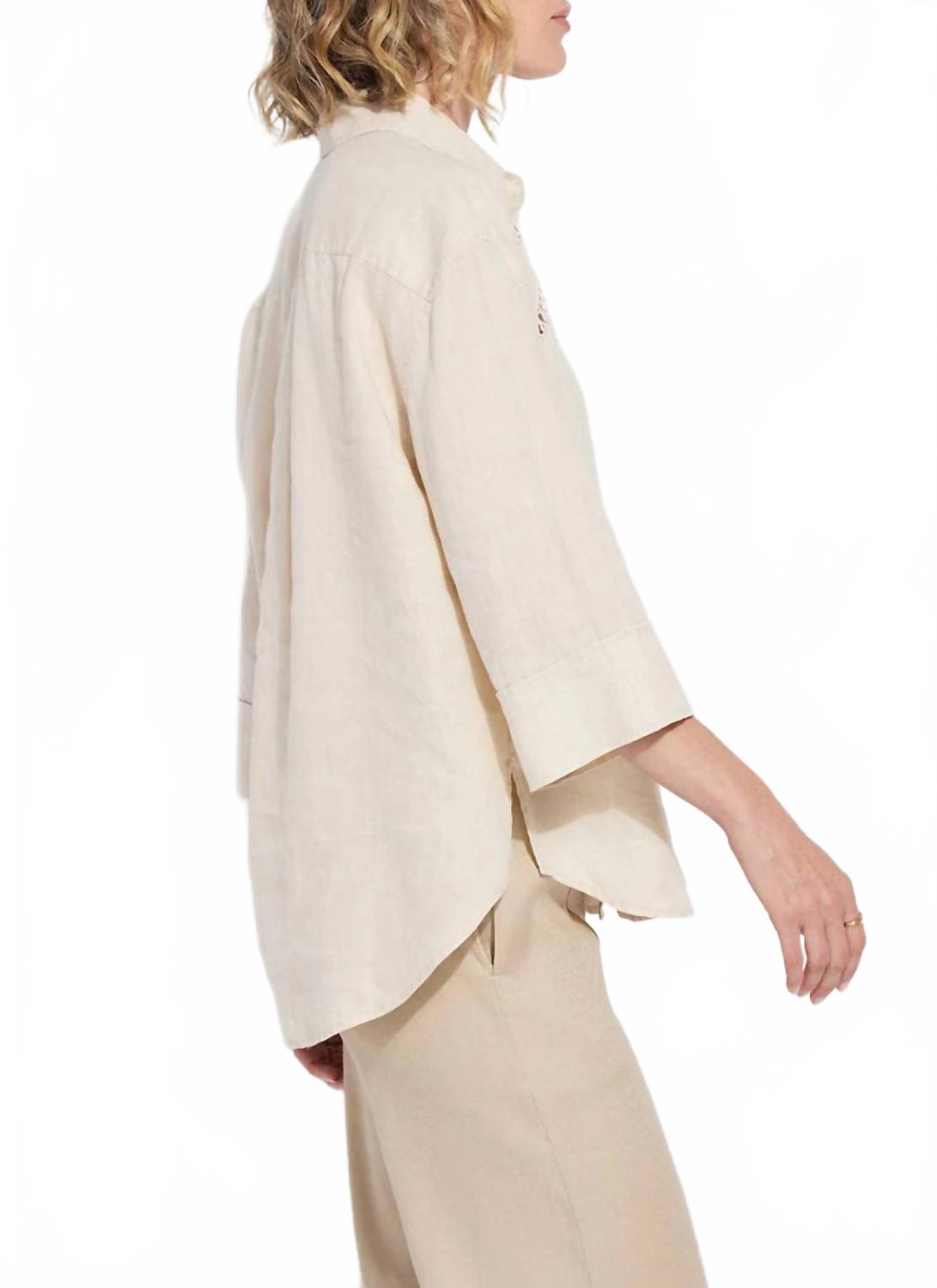 Эта женская рубашка на пуговицах с рукавами три четверти изготовлена из 100% льна, что обеспечивает ей естественную свободную посадку и роскошную мягкость. Рубашка отличается изысканными деталями, такими как двойная кокетка сзади, складка сзади и вышивка на кокетке спереди, а также закругленным асимметричным подолом с боковыми разрезами. Стирать в стиральной машине и сушить на веревке. Рост модели 178 см, размер S.