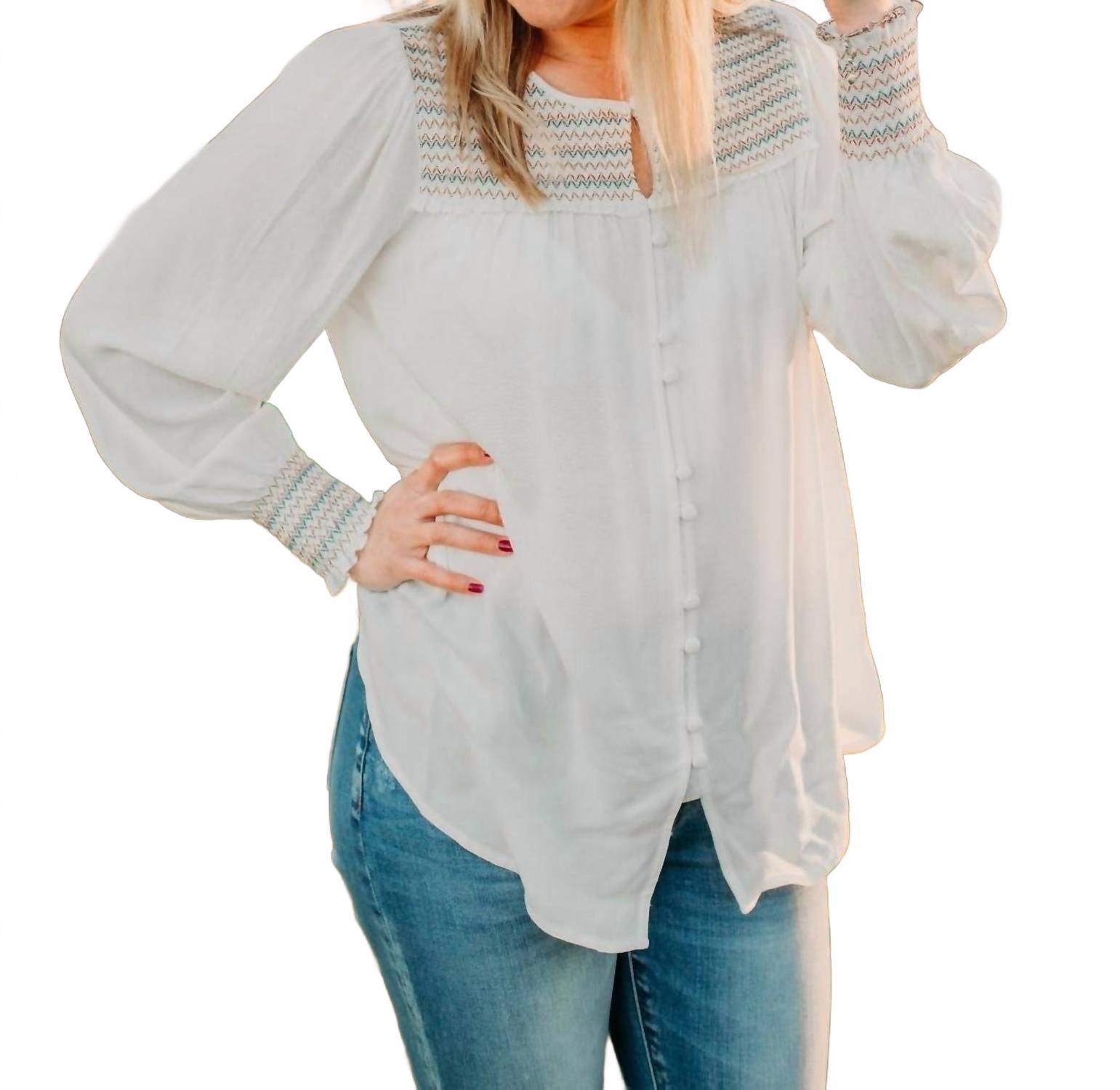 Блузка на все времена, которая никогда не выйдет из моды. Представляем блузку с вышитыми пуговицами от Doe and Rae - шикарное белое изделие, идеально подходящее для летнего отдыха. Эта блузка с длинными рукавами, украшенными изысканной вышивкой, и манжетами на резинке, дополнена круглым вырезом, придающим ей элегантность. Изготовленная из 100% вискозы, она обеспечивает комфорт и воздухопроницаемость в теплую погоду. Застежка: пуговицы. Рост модели - 178 см, размер S (обхват груди - 34B).