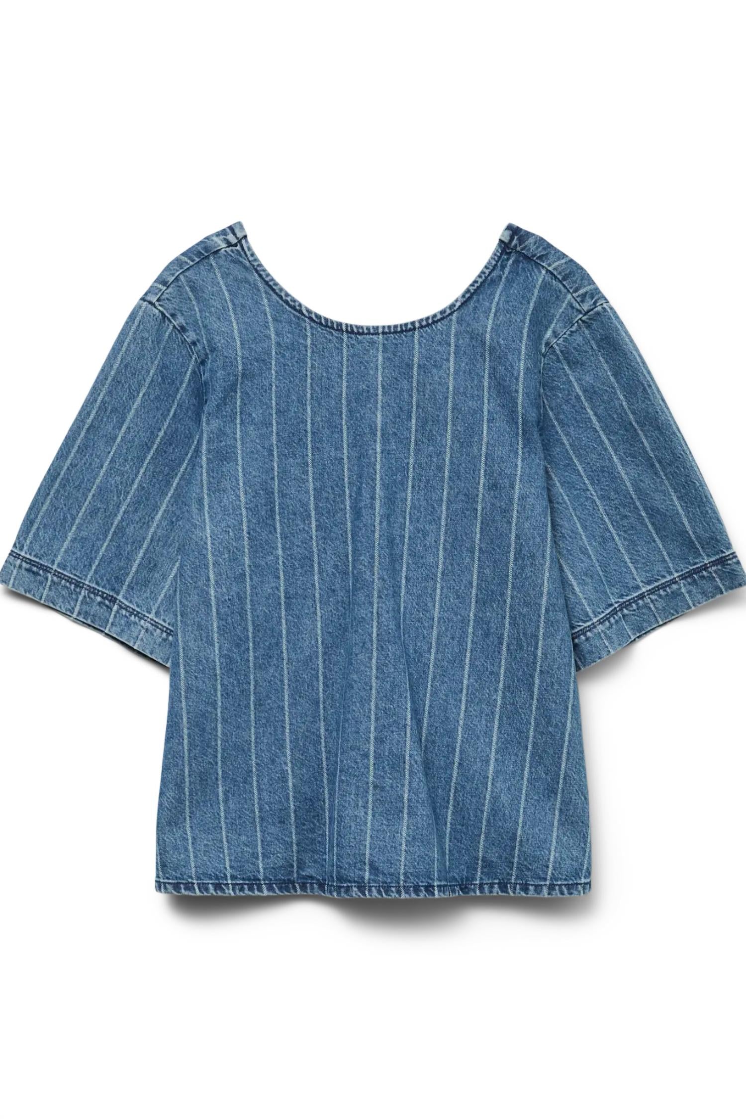 Универсальная блузка, которая подойдет и для работы, и для ужина! Встречайте блузку Striped Tie от VERO MODA - стильную вещь с женственным акцентом. Эта джинсовая блузка с короткими рукавами выполнена из 100% хлопка в нежную тонкую полоску выбеленного оттенка и завязывается на бабочку сзади, что добавляет игривости. Изящный А-образный силуэт добавит вашему образу нотку современности, а банты спереди сделают ее универсальной. Уход за блузкой прост: рекомендуем стирать в стиральной машине.