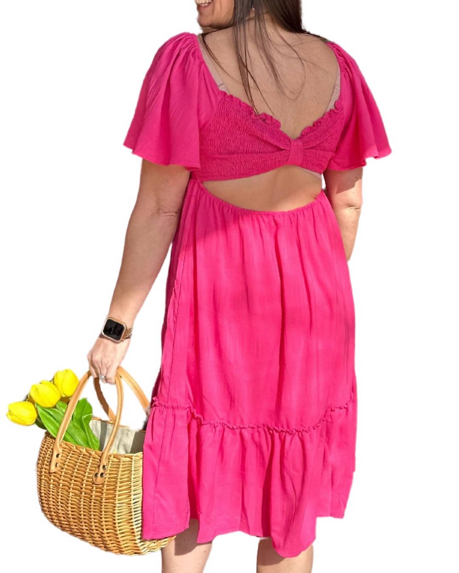 Короткое и воздушное платье для теплых дней. Платье Betty Bow от Jnna - великолепный выбор для любого летнего случая, сочетающий классическую элегантность и женственное очарование. Оно отличается короткими рукавами-крылышками и шикарным квадратным вырезом, а застежка-липучка завершает образ длиной миди. Платье выполнено в ярком цвете фуксии и украшено уникальным вырезом и бантом на спине. Это однотонное платье А-силуэта идеально подходит для пляжных дней, сочетая в себе стиль и комфорт.