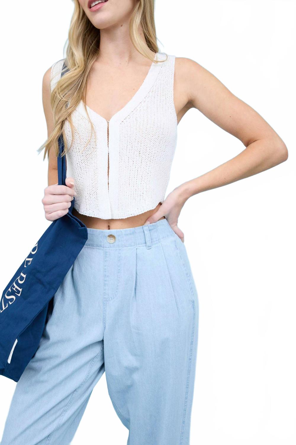 Идеальные капри для межсезонья. Сочетайте их с ботильонами или балетками! Дополните свой летний гардероб плиссированными джинсовыми капри Blu Pepper High Waist из классического шамбре. Эти капри отличаются высокой талией со шлевками для ремня и эффектной складкой спереди, дополненной удобной резинкой сзади. Изготовленные из 100% хлопка, они имеют свободный широкий силуэт и функциональные карманы, что делает их идеальными для минималистичных образов для званого ужина. Застежка: пуговицы.