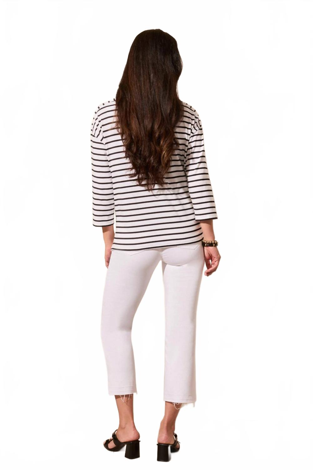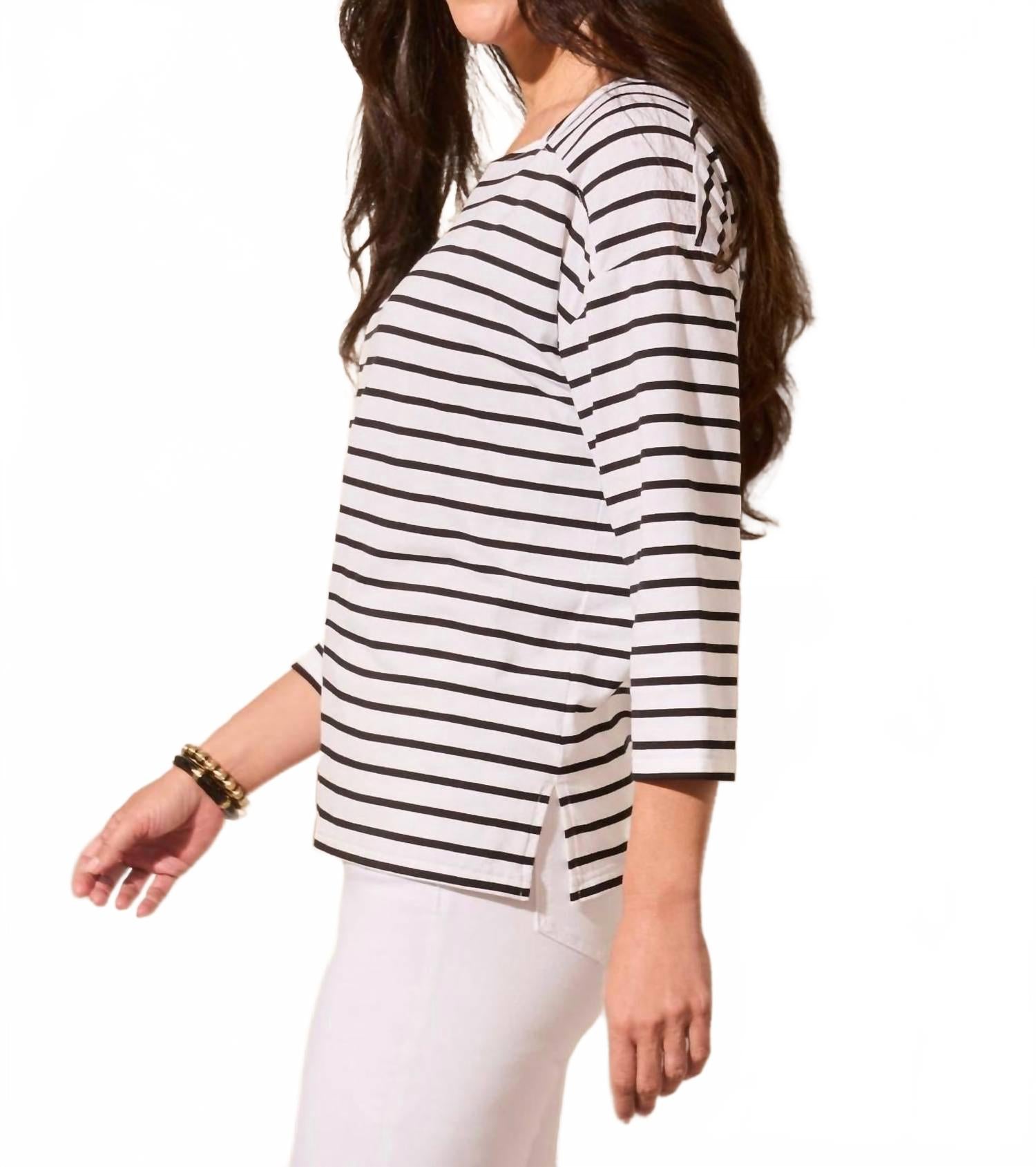 Универсальная блузка, которая подойдет как для работы, так и для ужина! Ощутите морской шарм с топом Stripe Boat Neck от TRIBAL, выполненным в классических черно-белых полосках и в стиле преппи. Эта блузка с рукавами три четверти, изящным вырезом лодочкой и удобной кокеткой на плечах подходит для межсезонья. Топ из 95% хлопка и 5% спандекса обеспечивает свободный крой и боковые разрезы для свободы движений. Застежка: надевайте. Уход: ручная стирка и сушка на горизонтальной поверхности.