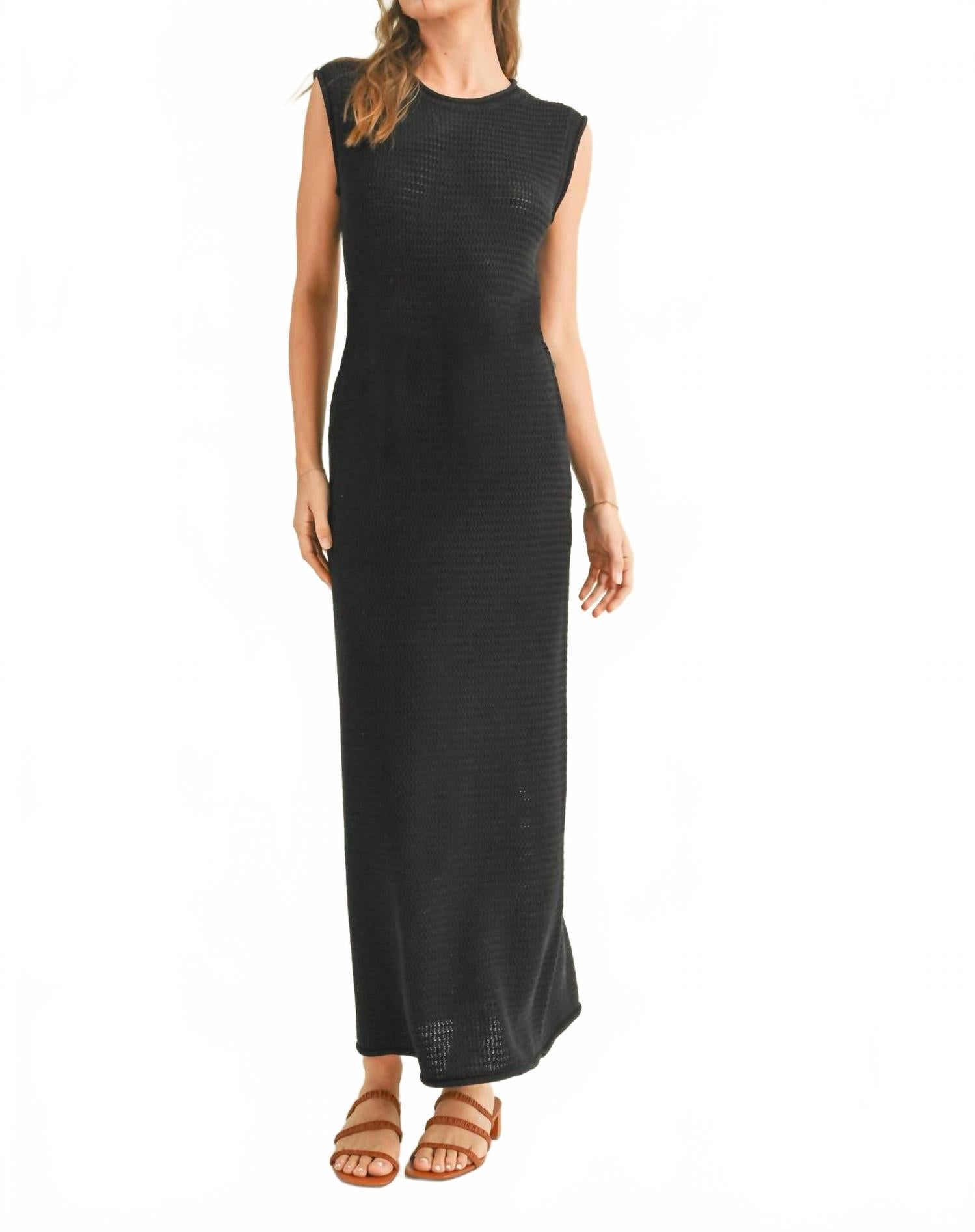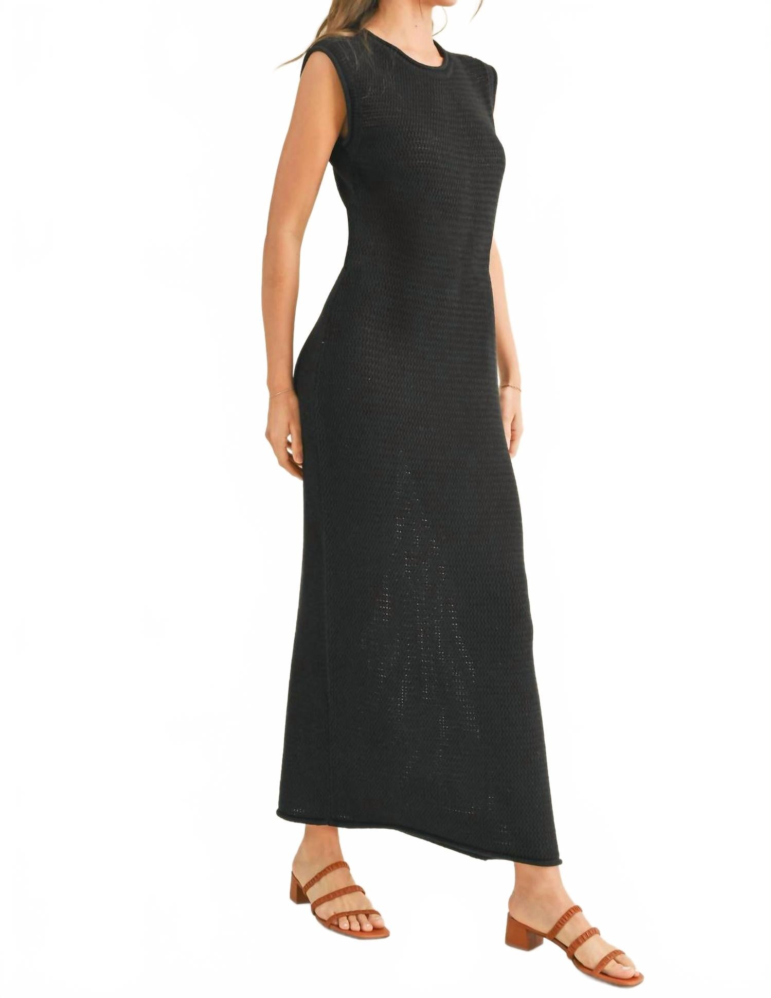 Просто добавьте шлепанцы или мюли, и все готово. Ощутите минималистичную элегантность в женском платье Lana от MIOU MUSE - однотонном черном платье миди, идеально подходящем для летнего отдыха. Это облегающее платье без рукавов, связанное крючком, подчеркивает его шикарный силуэт. Круглый вырез и удобная застежка-липучка гармонично сочетают в себе стиль и комфорт. Это универсальное изделие идеально подходит для любой летней прогулки и станет незаменимым дополнением к любому гардеробу.