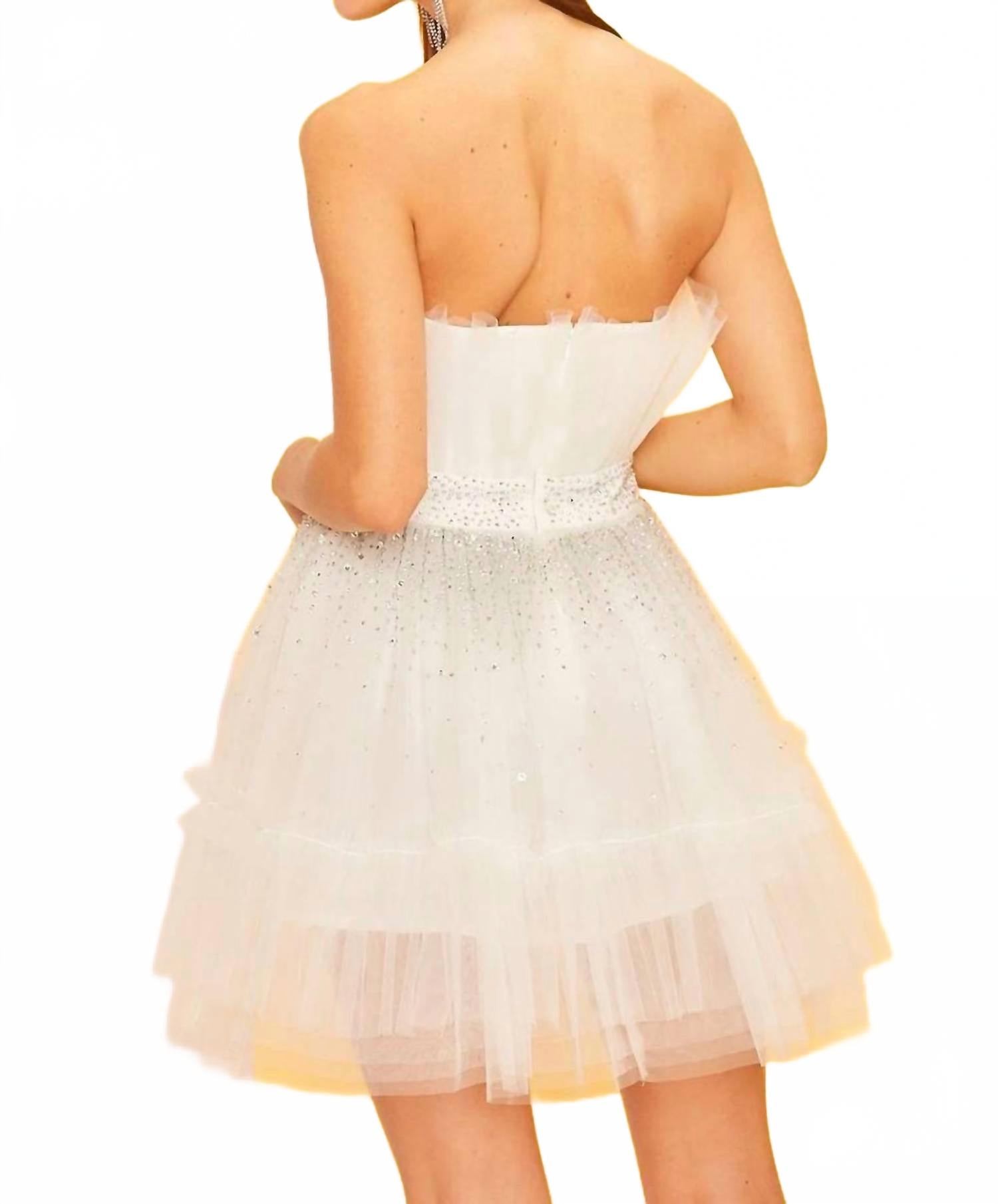 Легкое и элегантное платье, которое вы будете носить весь сезон. Дополните свой весенний гардероб платьем Bling Pixie от Main Strip, которое идеально подходит для особых случаев, таких как свадьбы или празднование Синко де Майо. Это элегантное мини-платье А-силуэта белого цвета без рукавов с открытыми плечами украшено отделкой из стразов для дополнительного блеска. Это фактурное изделие из роскошной смеси 97% полиэстера и 3% спандекса обеспечит комфорт и стиль. Застежка: молния сзади.