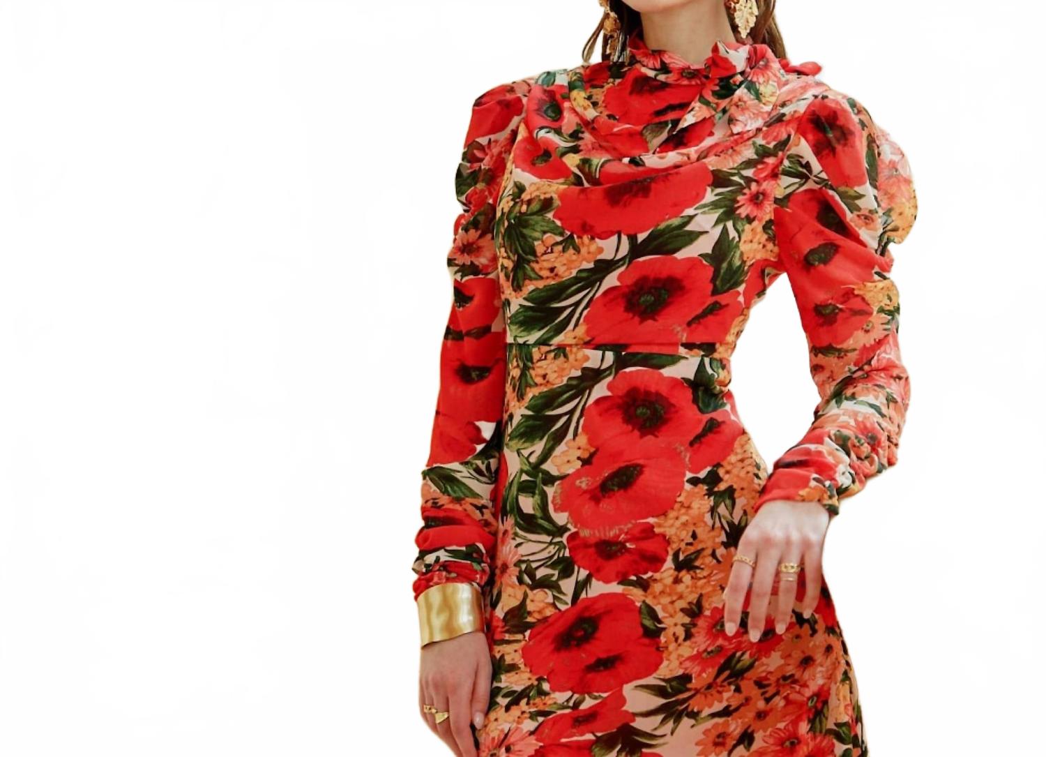 Идеальное платье с длинными рукавами для прохладных месяцев. Представляем платье Alma Puff Sleeve Dress от Esteem Couture - восхитительный предмет вашего весеннего гардероба. Это платье с длинными рукавами длиной миди украшено ярким красным цветочным узором и игривыми рукавами-буфами, создающими винтажный шарм. Платье выполнено в струящемся силуэте, дополнено воротником-стойкой и завязкой сбоку для дополнительной элегантности. Застежка - молния. Инструкции по уходу не предоставляются.