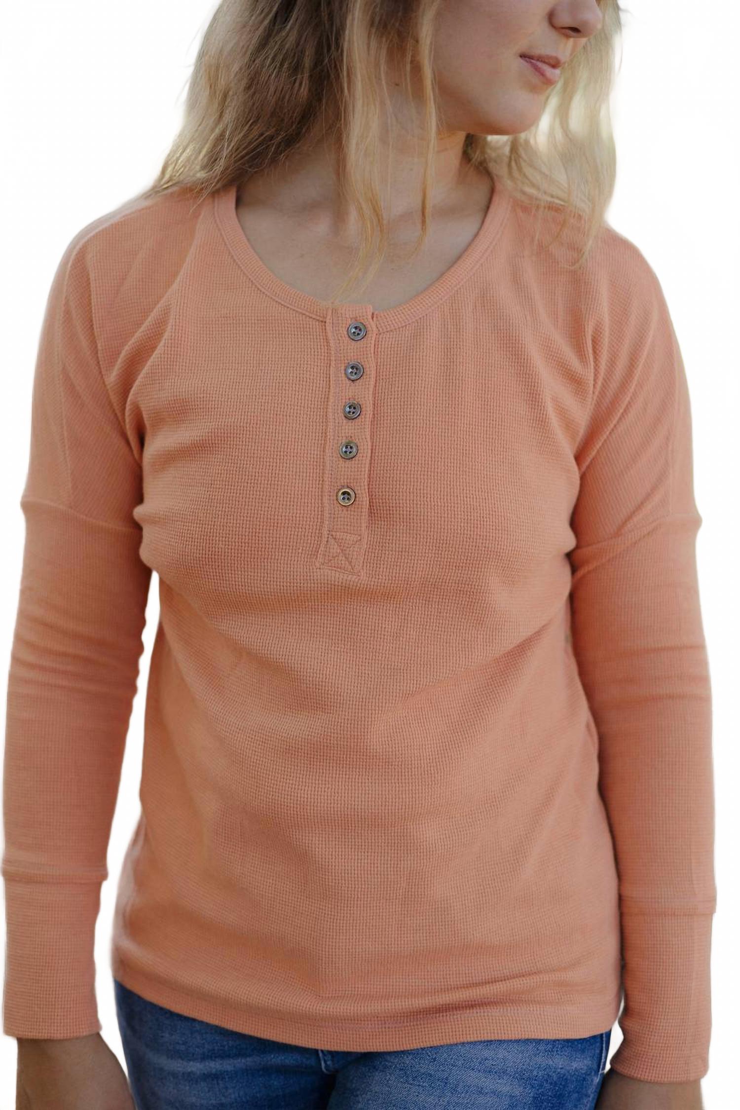 Украсьте свой весенний гардероб топом Camila с длинными рукавами хенли от Threaded Pear в текстурированном лососевом цвете. Этот топ с длинными рукавами и круглым вырезом имеет свободный крой и вафельную вязку, обеспечивающую уют. Застежка на функциональные пуговицы добавляет нотку моды 90-х. На Джесси размер S, идеальный для путешествий или праздничных мероприятий, таких как День благодарения.