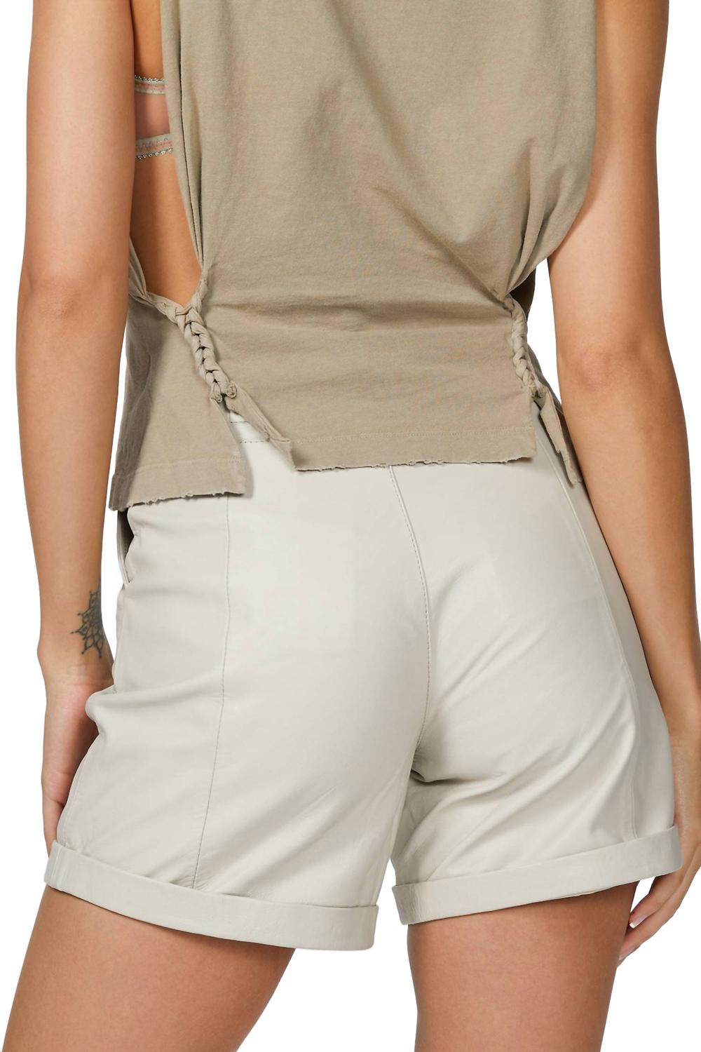 Эти кожаные шорты «Suzy» с двойной складкой спереди, боковыми карманами и подвернутым краем будут особенно стильно смотреться с заправленной в них футболкой, блузкой или свитером.