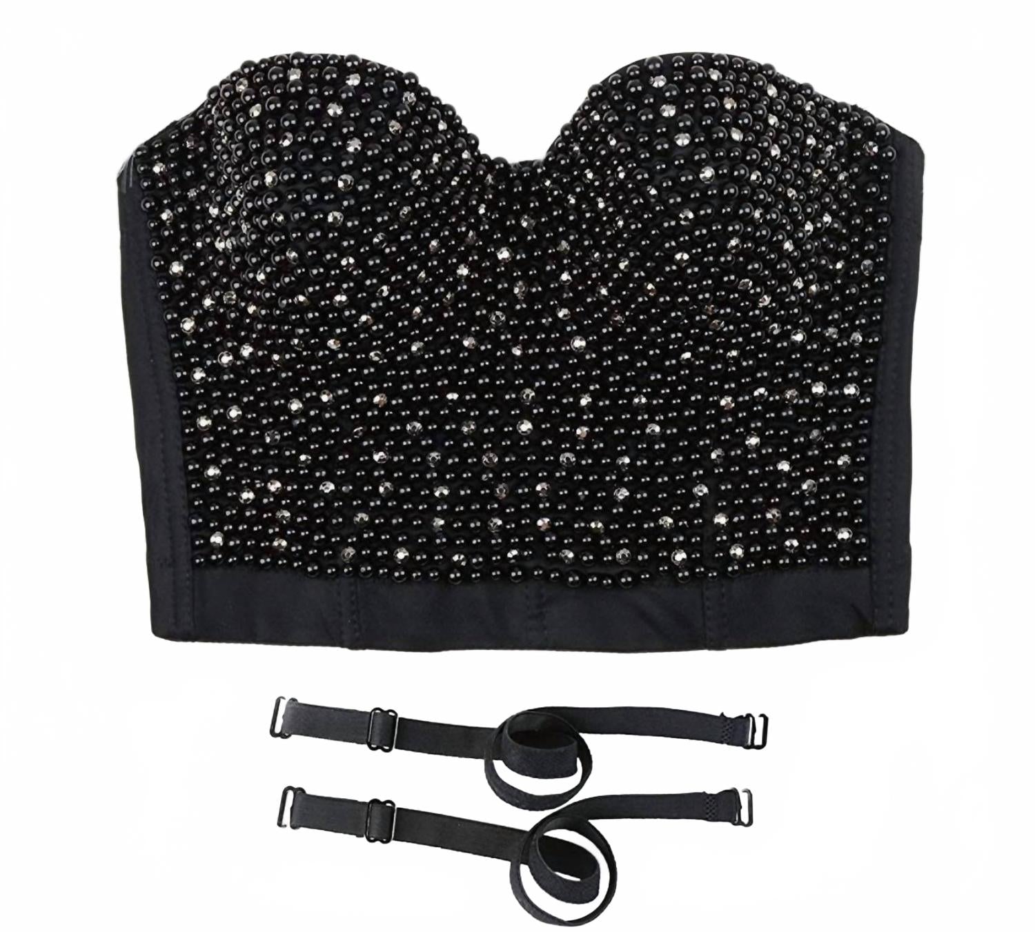 Продемонстрируйте немного своей красоты в этом милом и непринужденном укороченном топе. Представляем корсет She's So Extra от JBLA - эффектное изделие, воплощающее тренд 2000 года своим элегантным дизайном. Тонкие бретельки, украшенные жемчугом, дополнены атласной лентой для придания изюминку. Состав: черный цвет: 93% полиэстер, 7% спандекс для идеальной посадки. Застежка: крючок. На модели размер S (2-4). Идеально подходит для коктейльных вечеринок и празднования Нового года.