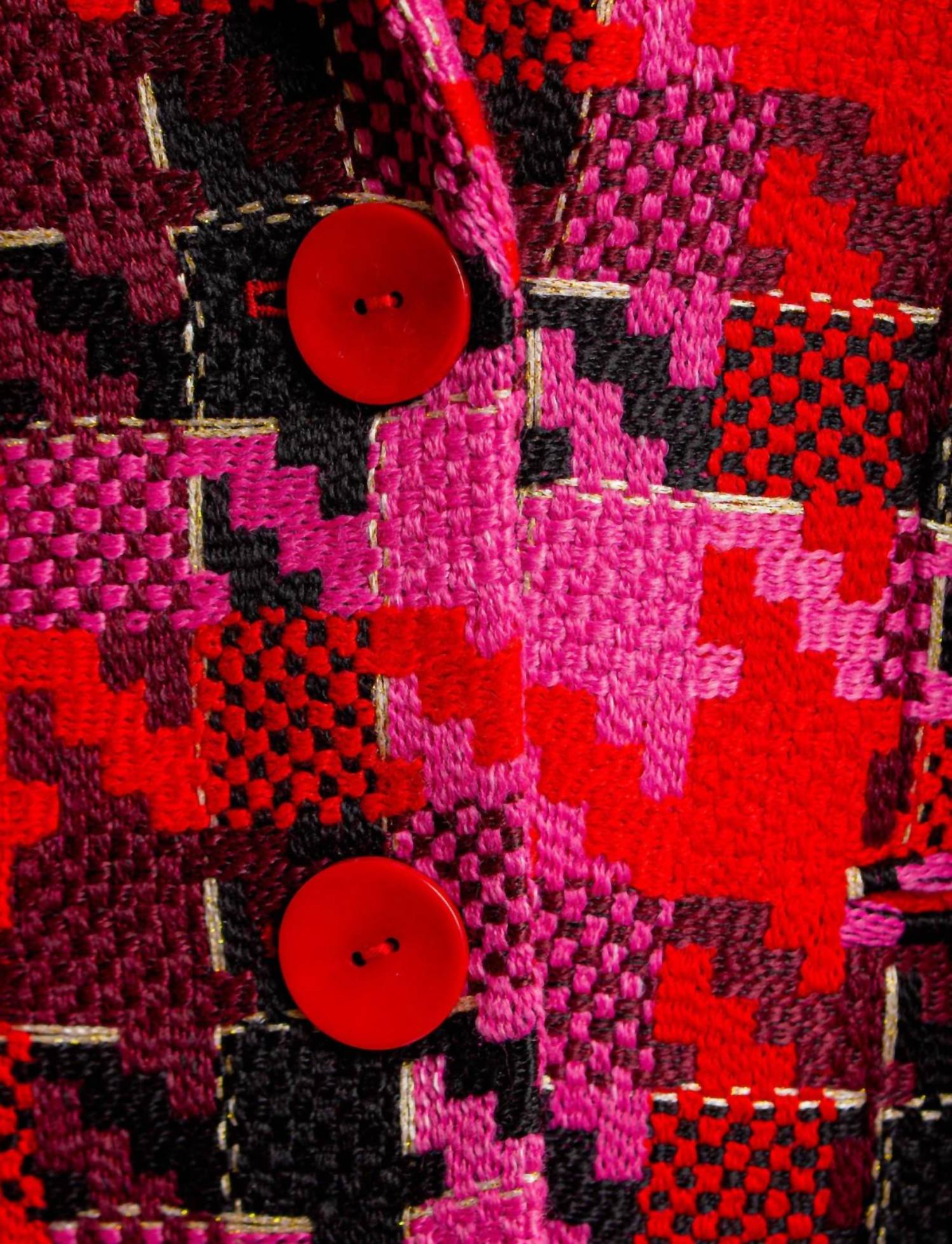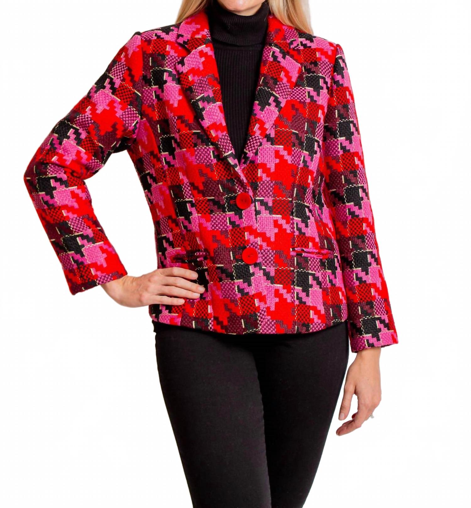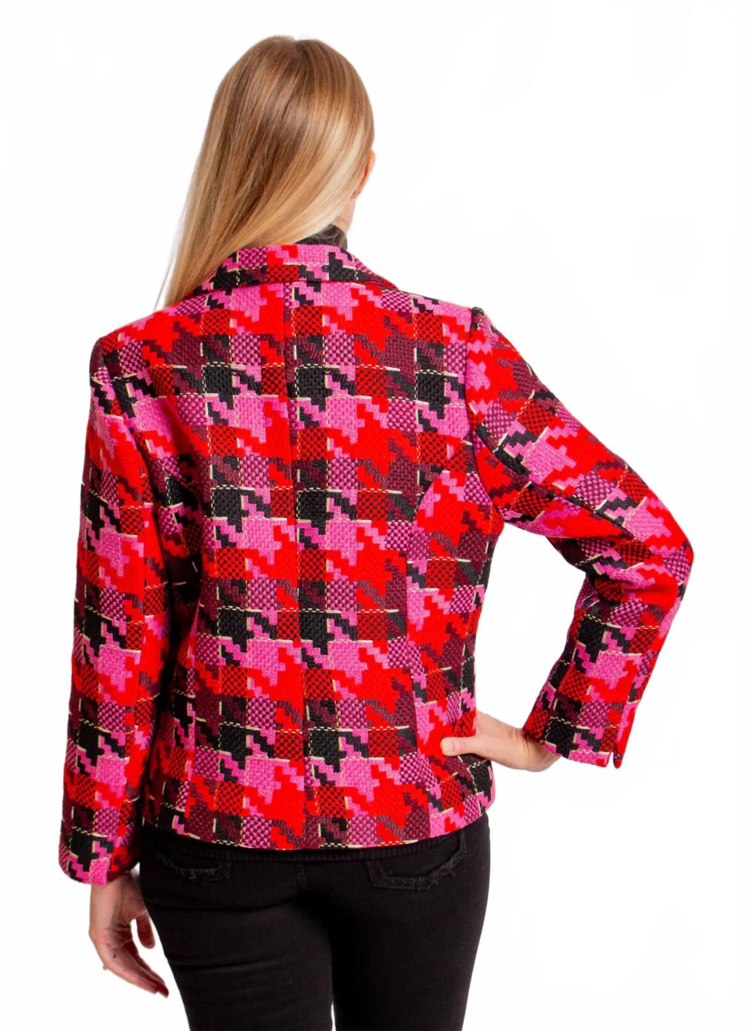 Этот универсальный блейзер можно носить в офис или сочетать с джинсами для создания более повседневного образа. Выведите свой стиль на новый уровень с нашим блейзером Preppy in Pink. Этот твидовый блейзер с узором «гусиная лапка» представлен в различных оттенках розового и черного, добавляя нотку изысканности любому образу. Будьте стильными и элегантными с этой незаменимой вещью. Блейзер с розово-красным узором, застежкой на пуговицы спереди, длинными рукавами и карманами. Ткань: