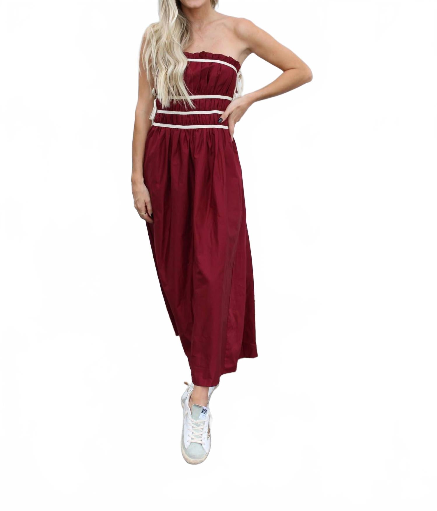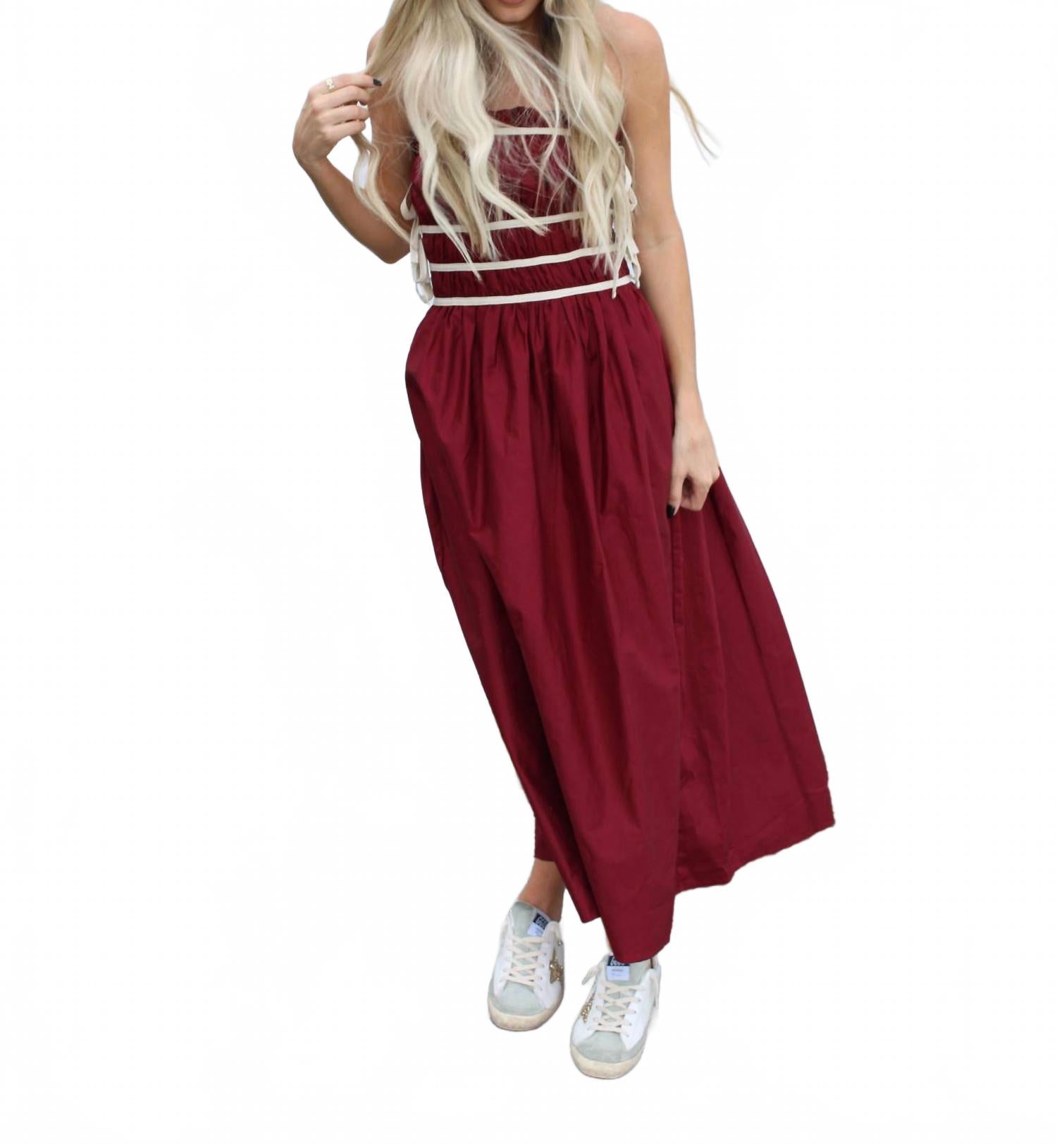 Платье идеальной длины существует. Представляем платье-миди Sadie от Sofie the Label - идеальное дополнение к вашему осеннему гардеробу или гардеробу на День благодарения. Это однотонное красное платье без бретелек с квадратным вырезом и элегантным А-образным силуэтом. Изготовленное из 100% хлопка, оно имеет сборчатый верх и завязки по бокам. Для дополнительного удобства предусмотрены карманы. Уход прост: ручная стирка в холодной воде, сушка на веревке и глажка при необходимости.