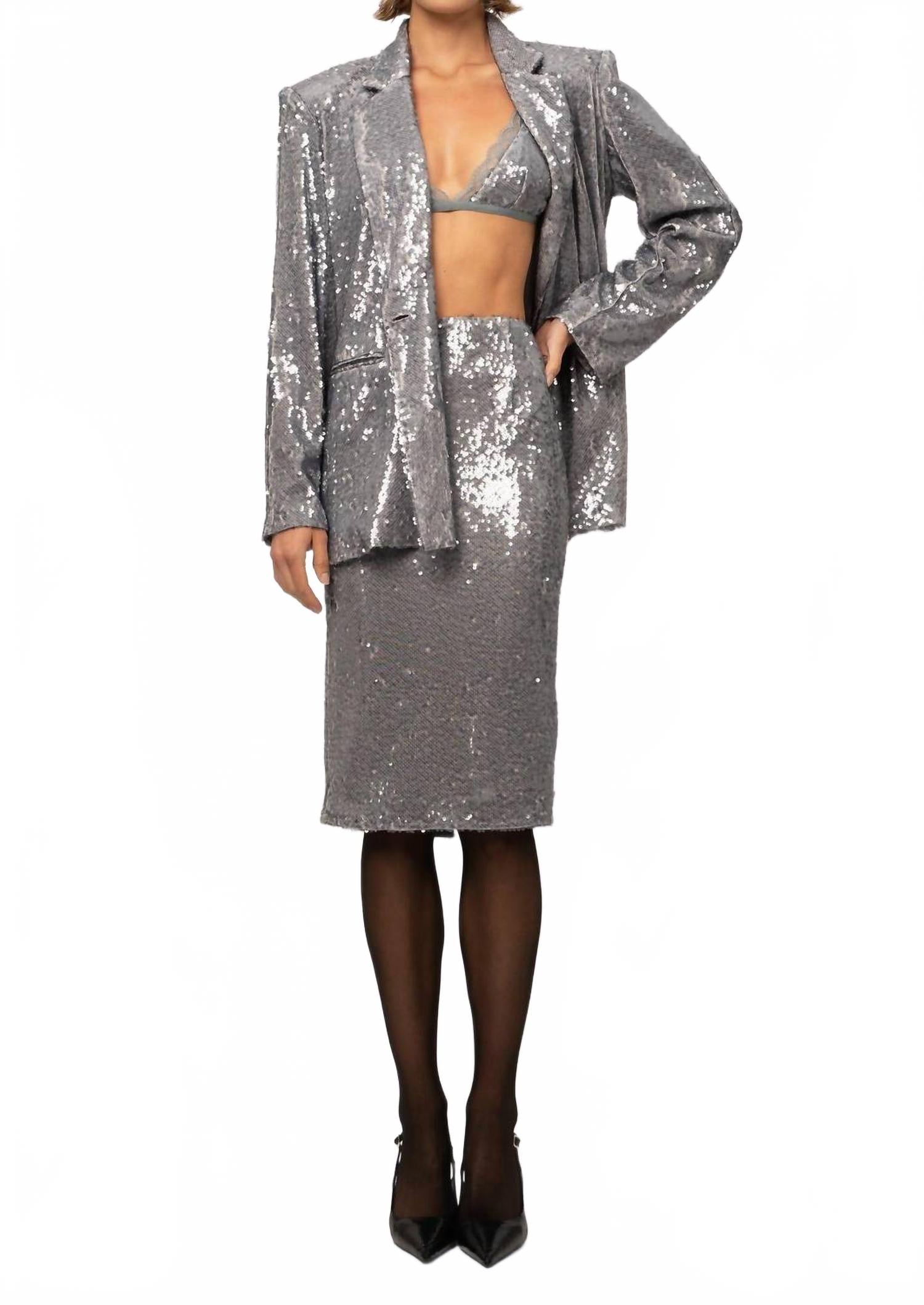 Идеально скроенный, этот блейзер станет вашим незаменимым аксессуаром на долгие годы. Блейзер Sylvie от Nonchalant Label - эффектная модель с серебристыми пайетками, которая добавит нотку гламура любому образу. Этот свободный блейзер с длинными рукавами и фактурным узором выполнен из искусственной кожи. Изготовлен без подкладки, он имеет практичные карманы и классический воротник. Блейзер застегивается на пуговицы, что делает его идеальным выбором для вечерних мероприятий весной.