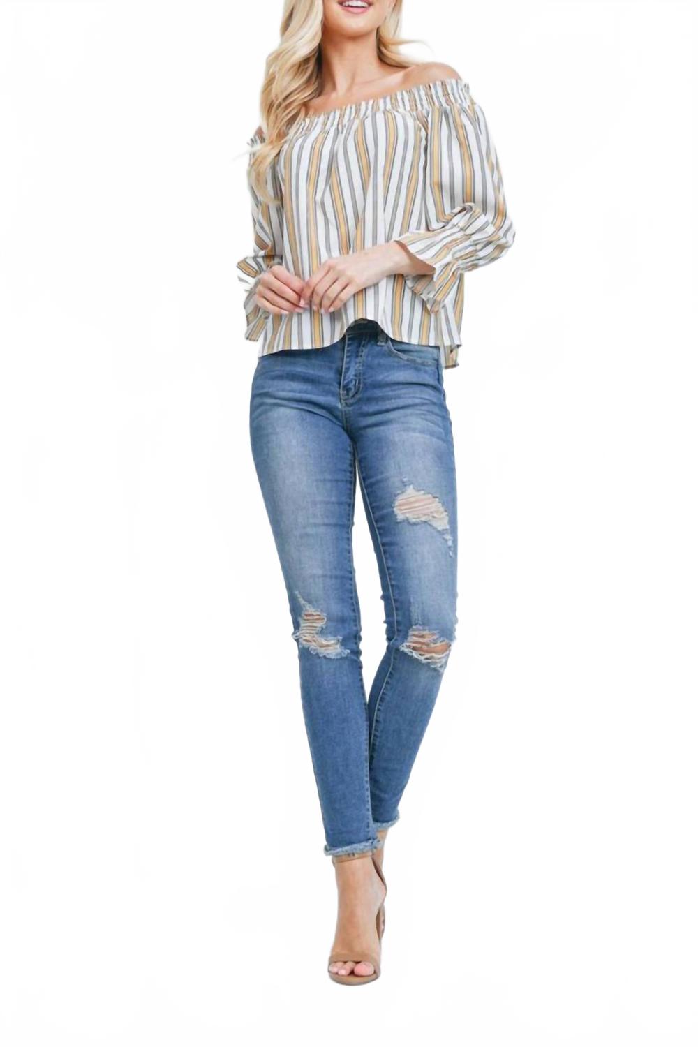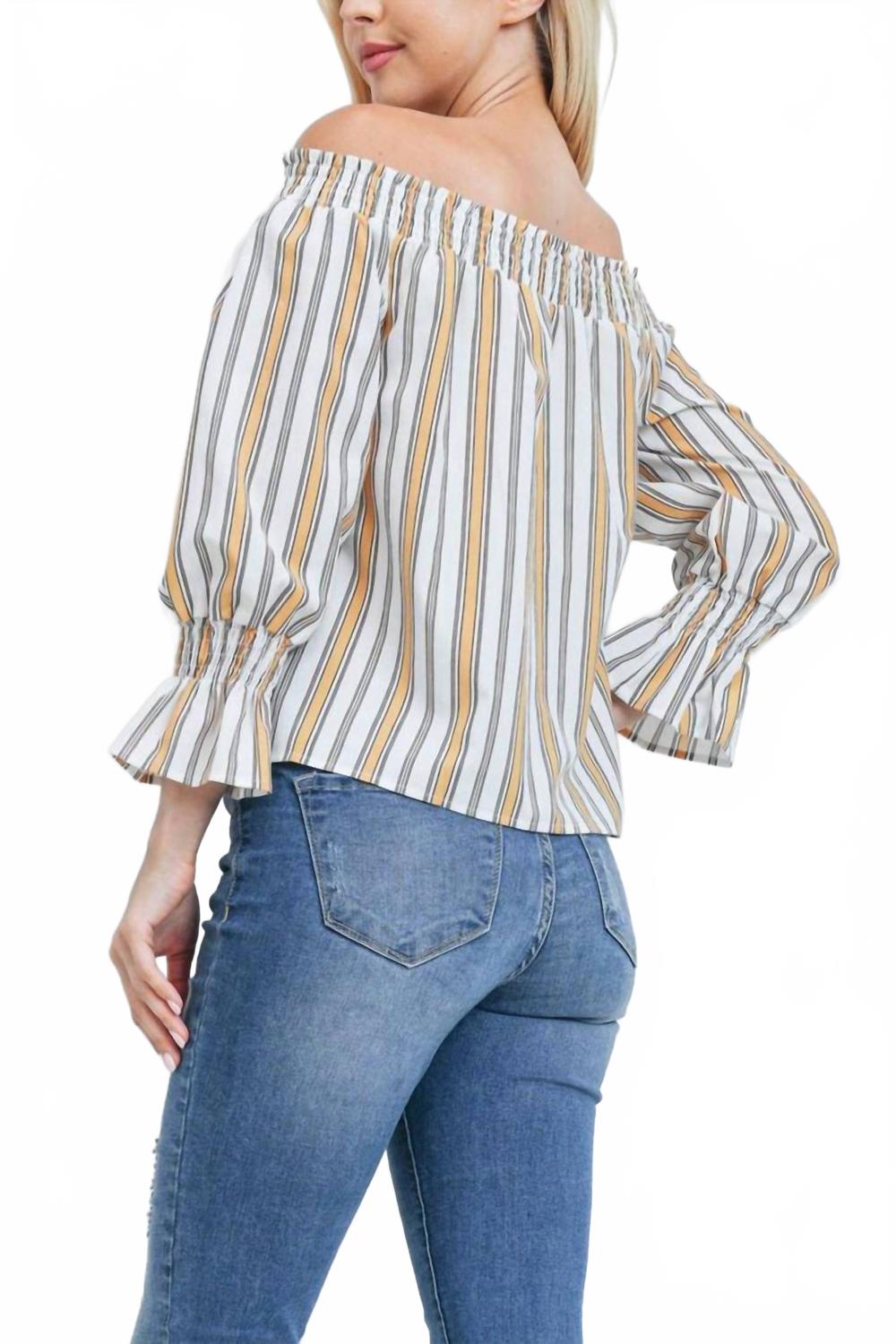 Универсальная блузка, которая подойдет как для работы, так и для ужина! Дополните свой летний гардероб топом Stripes-Top от FLYING TOMATO, выполненным в элегантной бело-желтой полоске. Эта женская блузка с модным вырезом на плечах и рукавами три четверти создает эффектный образ. Состав: 100% полиэстер. Застежка: на застежке. Этот топ идеально подходит для летних мероприятий, например, для вечеринки в честь рождения ребенка, сочетая в себе роскошный стиль и непринужденный комфорт.