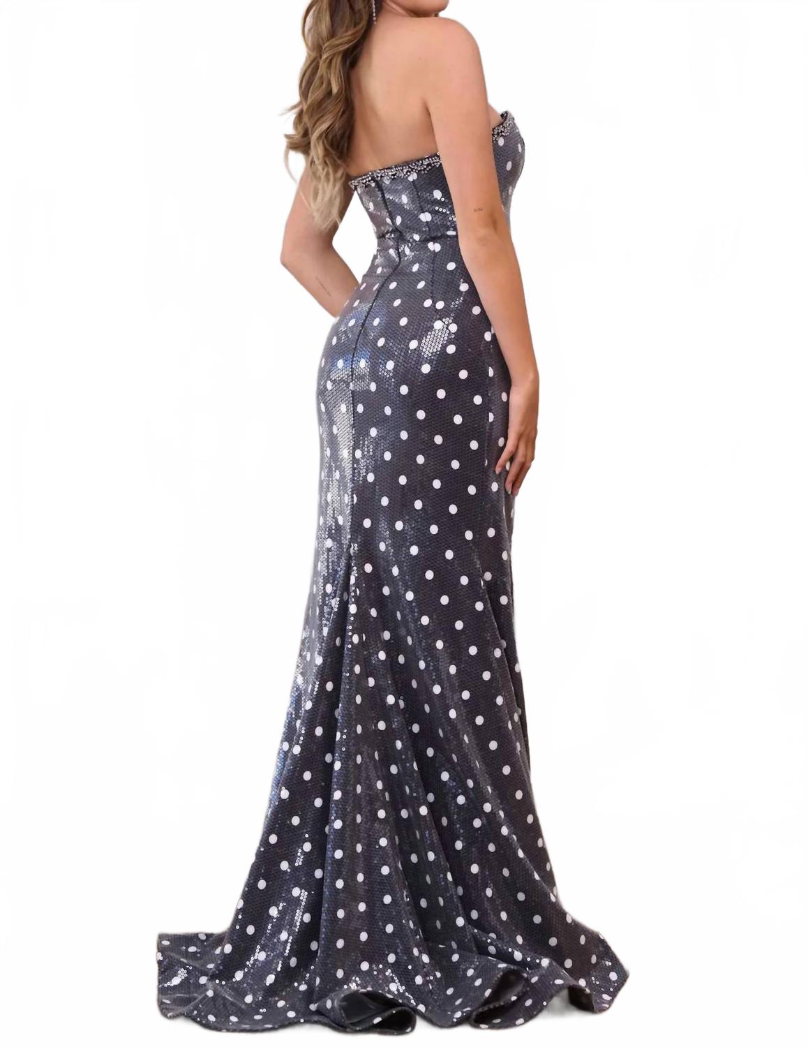 Платье-русалка без бретелек с пайетками и горошком от Ava Presley - эффектный выбор для выпускного вечера или гламурных мероприятий. Без бретелек - великолепный выбор для эластичной ткани с ярким белым горошком на черной основе. Это платье длиной в пол отличается соблазнительным прямым вырезом с отделкой из бисера, открытой спиной и смелым разрезом до бедра, придающим образу еще больше очарования. Застежка: молния.