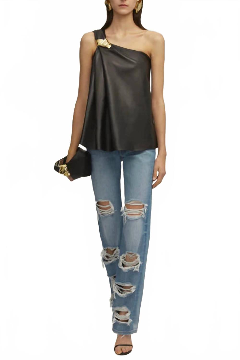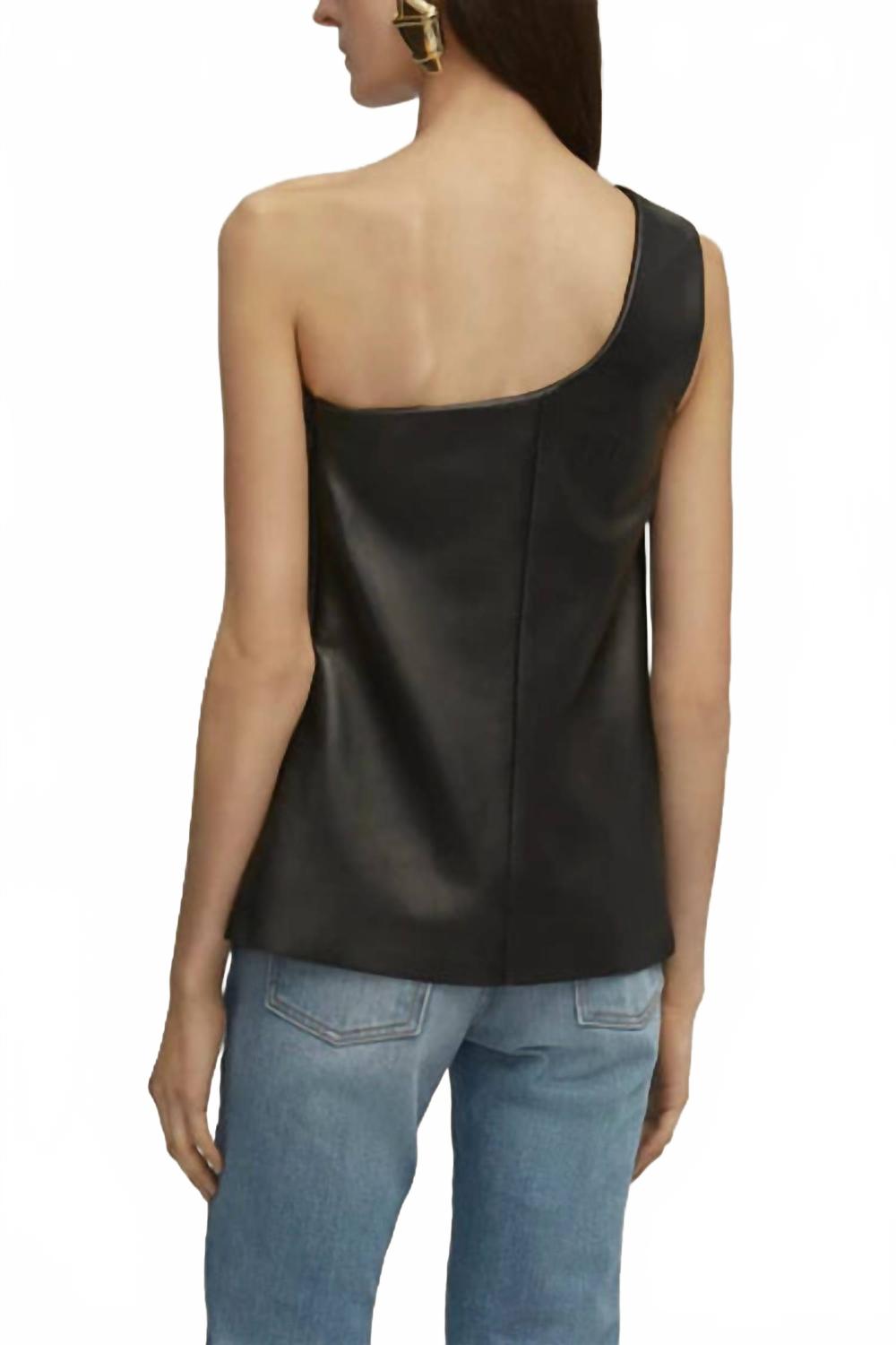 Блузка, которая никогда не выйдет из моды. Представляем топ Delia Shoulder Knot от Brandon Maxwell - эффектное дополнение к вашему гардеробу, воплощающее сдержанную роскошь. Этот силуэт без рукавов с открытыми плечами излучает элегантность. Он искусно выполнен из роскошной черной кожи ягненка наппа и дополнен позолоченной фурнитурой в виде узелков. Изготовлено в Нью-Йорке, имеет удобную потайную молнию сбоку. Инструкция по уходу: только химчистка. Рост модели 180 см, размер XS.