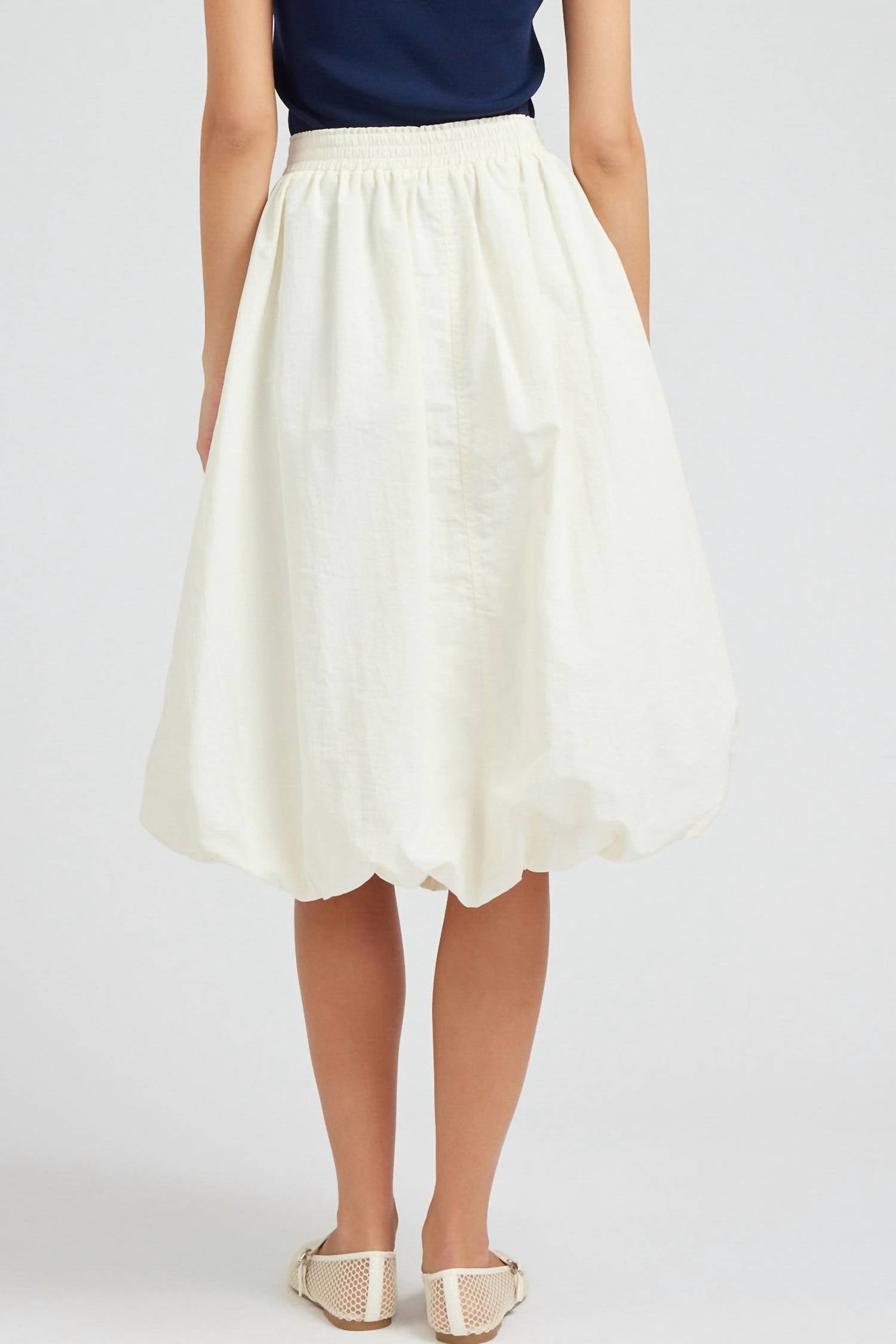 Заправьте свою любимую футболку в эту юбку миди, чтобы создать стильный и непринужденный образ. Юбка Sarai Midi Bubble Skirt от Current Air - изысканная кремовая модель, которая добавит элегантности любому образу. Юбка отличается уникальным низом-баллоном и эластичным поясом для комфорта и стиля. Изготовлена ​​из 100% нейлона, имеет удобную посадку и элегантную застежку-липучку. Уход: машинная стирка и сушка в разложенном виде. На модели размер S, что соответствует заявленному.