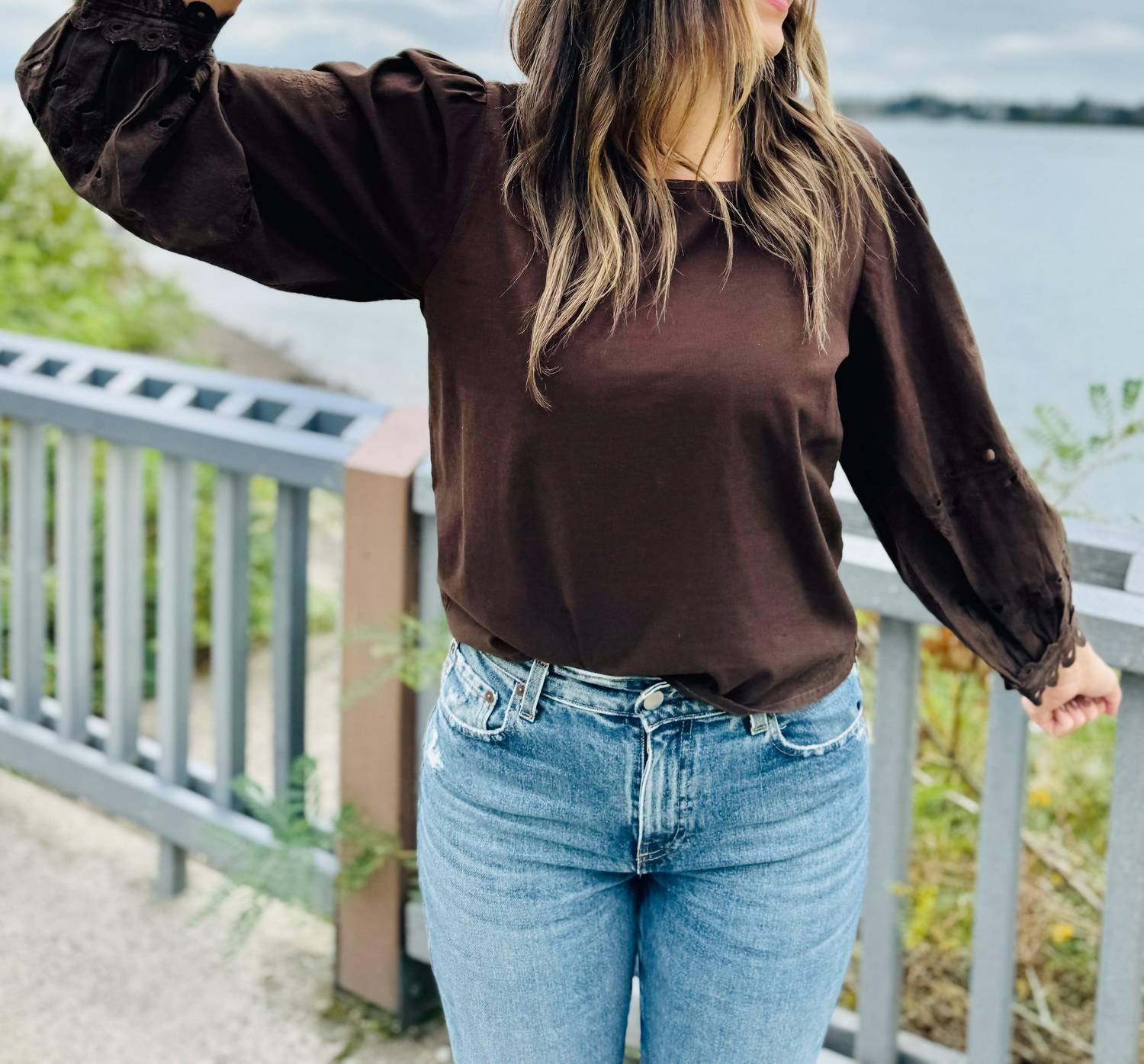 Блузка Maisie Cutwork от Dylan - это осенний топ с длинными рукавами с вырезами, который добавит стильную изюминку вашему образу. Эта фактурная блузка из хлопка теплого коричневого оттенка идеально подходит для этого сезона. Благодаря классическому круглому вырезу и удобной застежке-липучке, она идеально подходит для неформальных встреч и достаточно универсальна как для офиса, так и для бранча. Этот топ создает непринужденный образ, прекрасно сочетаясь с джинсами и ботинками.