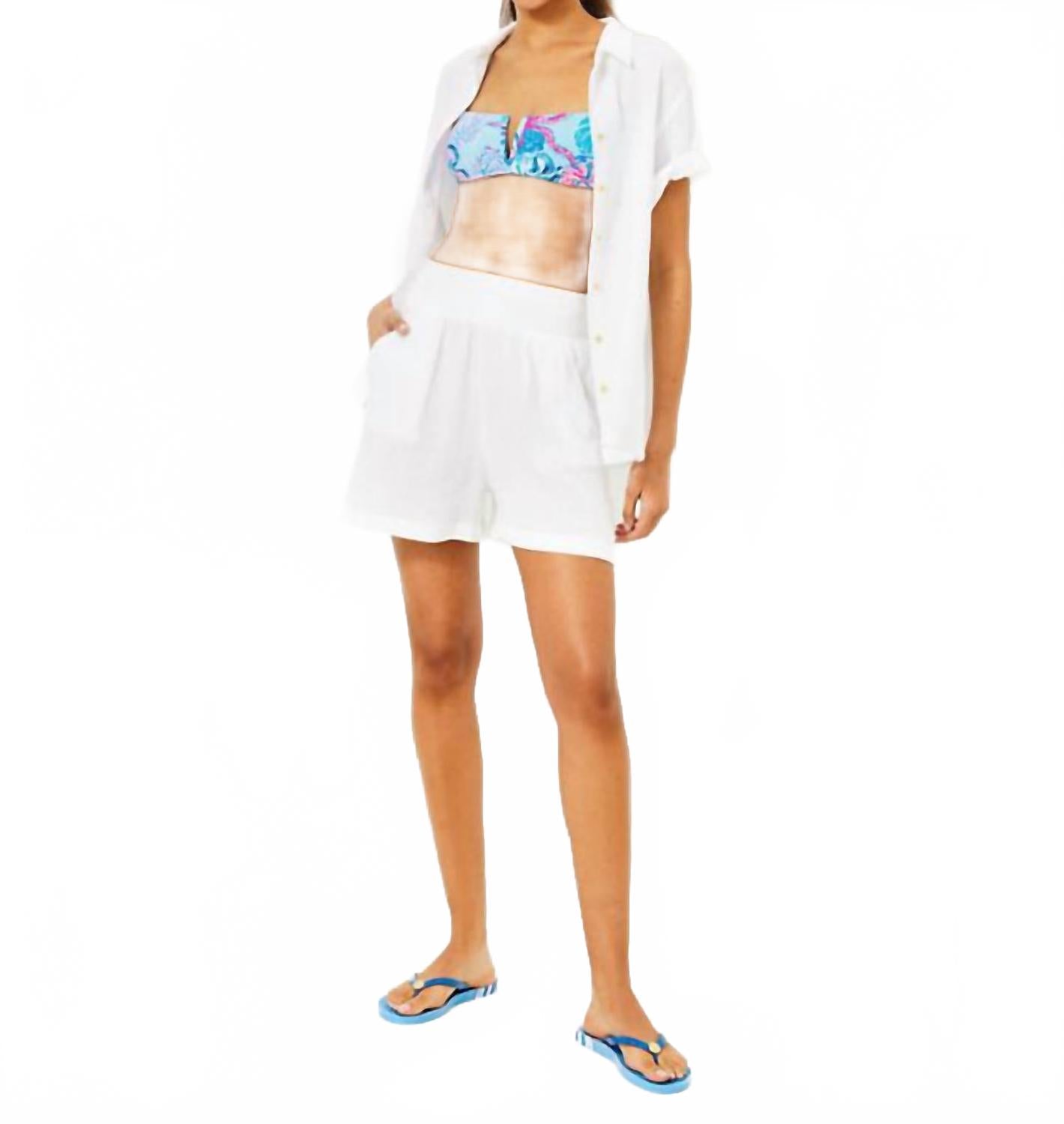 Идеальный вариант для вечеринок у бассейна, пляжных дней и долгих выходных. Шорты Portor Coverup от Lilly Pulitzer - идеальный летний предмет гардероба благодаря очаровательному присборенному поясу и прорезным карманам по бокам для дополнительного удобства. Эти белые шорты из 100% хлопка обеспечивают комфорт и воздушную влагу, идеально подходя для теплой погоды. Благодаря застежке-липучке и импортному качеству они удобны в носке. Уход прост: можно стирать в стиральной машине.