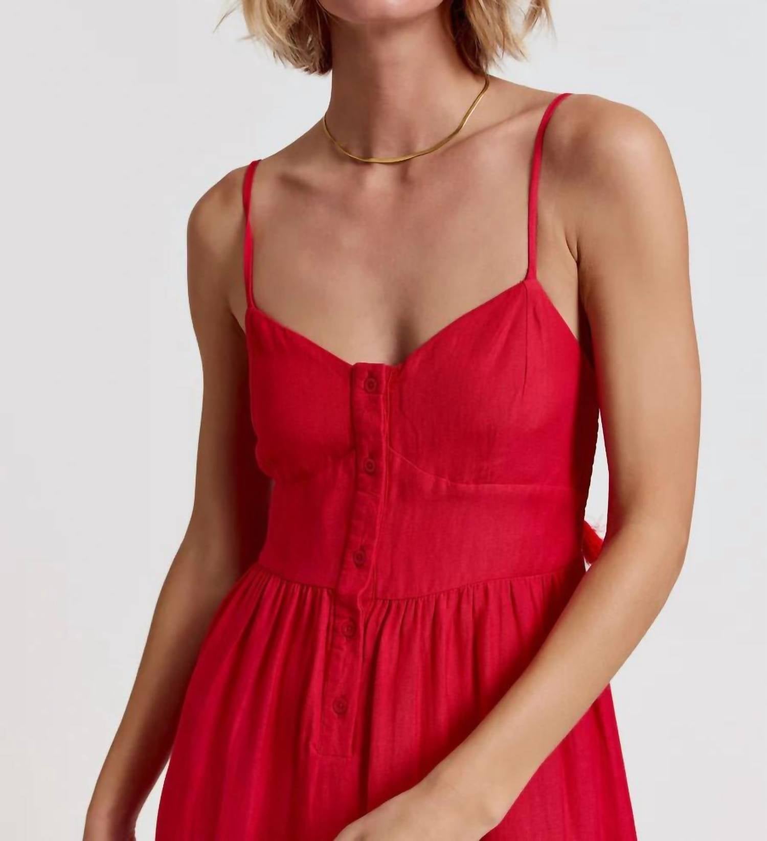 Просто добавьте шлепанцы или мюли, и все готово. Встречайте платье Leora от THE SHIRT - потрясающее дополнение к вашему гардеробу в ярком вишневом цвете. Это платье миди А-силуэта с тонкими бретельками и шикарным V-образным вырезом идеально подходит для прогулок в теплую погоду. Благодаря однотонному узору и удобной застежке на пуговицы, его можно носить как с кроссовками, так и с сандалиями. Идеальное сочетание стиля и комфорта - это платье создано для солнечных приключений.