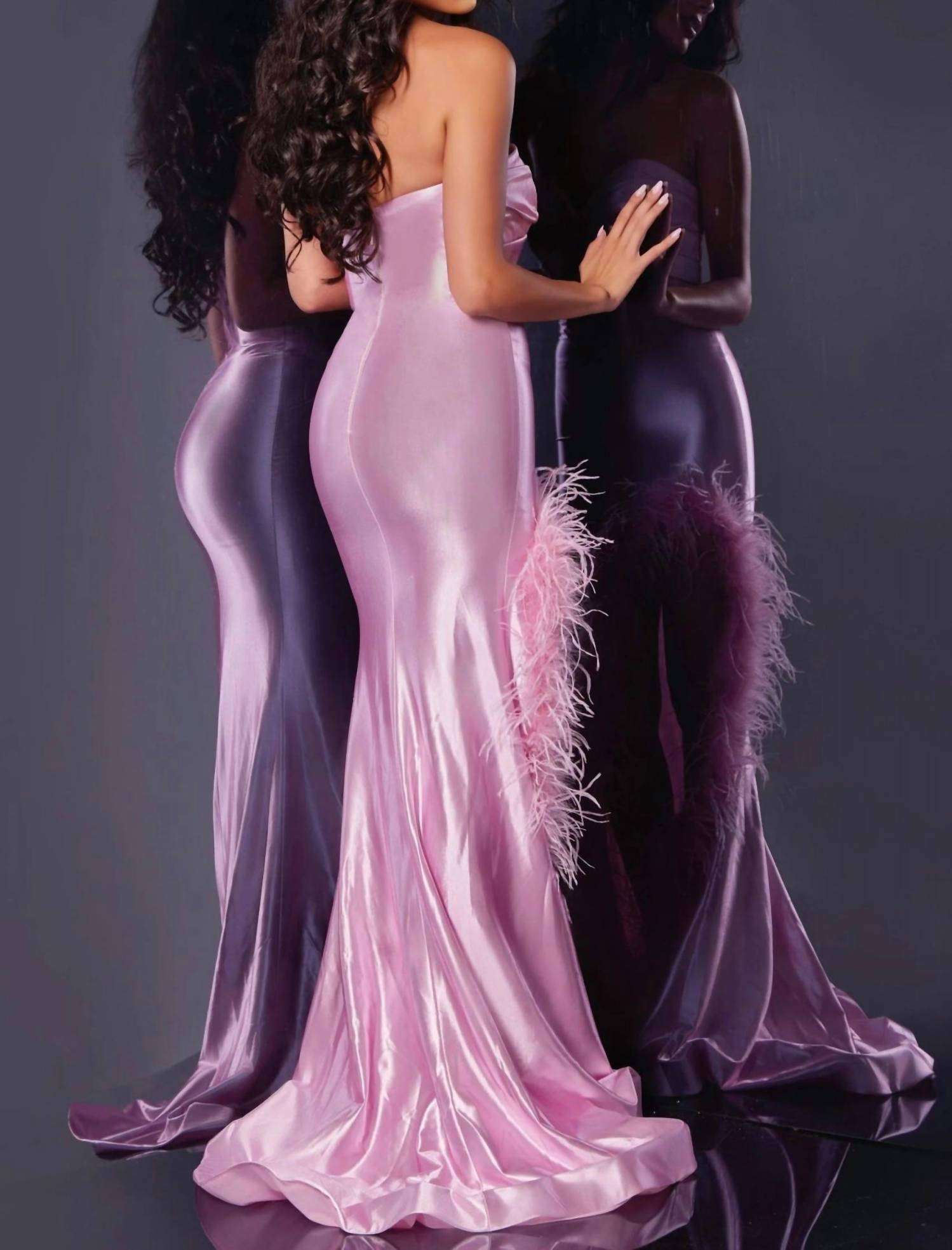 Представляем атласное платье Jovani с разрезом, отделкой из перьев, - изысканное изделие, которое сделает любое событие незабываемым. Это платье без бретелек нежно-розового цвета с вырезом сердечком и приталенным силуэтом «русалка». Платье из роскошного атласа длиной до пола дополнено высоким разрезом, украшенным элегантными перьями, что придает образу нотку драматизма.