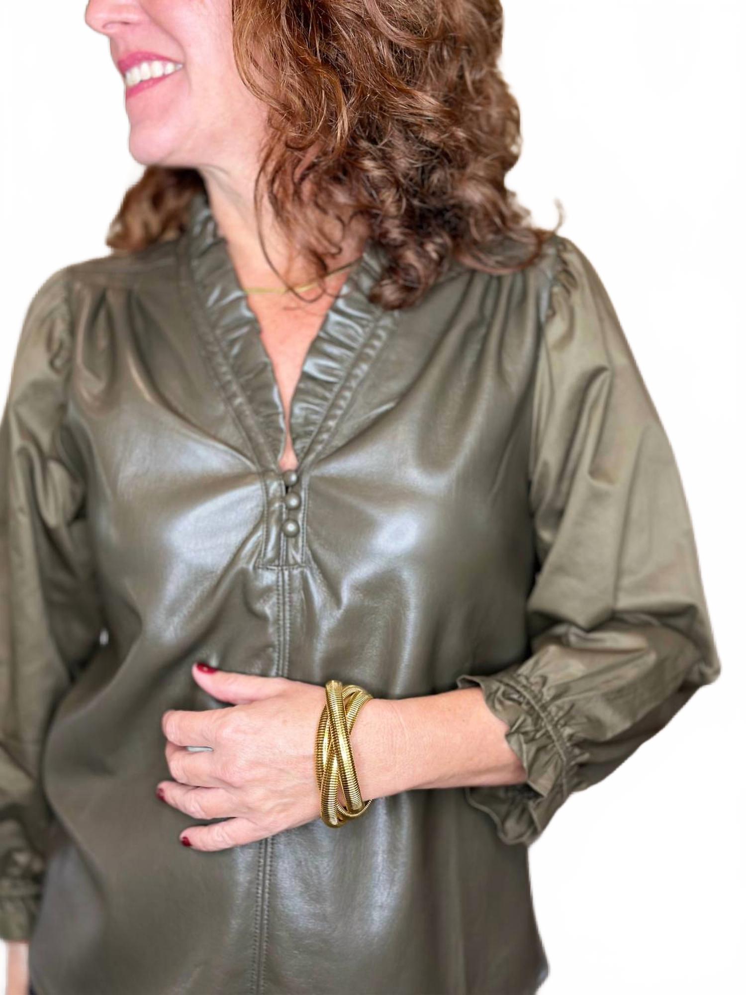 Универсальная блузка, которая подойдет как для работы, так и для ужина! Откройте для себя топ Adria от MELISSA NEPTON в шикарном темно-хаки-топе, который создаст стильный и элегантный образ. Эта изысканная блузка с рукавами три четверти выполнена из хлопкового поплина и мягкой искусственной кожи, а также дополнена оборкой вокруг V-образного выреза. Состав: 65% полиуретан, 35% хлопок. Уход: ручная стирка, сушить на горизонтальной поверхности. Рост Кэтлин - 160 см, размер S.