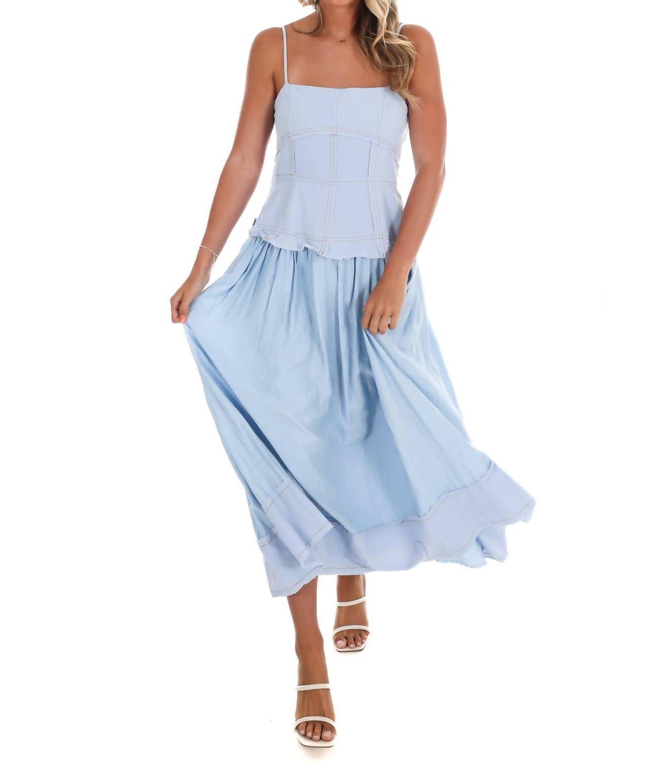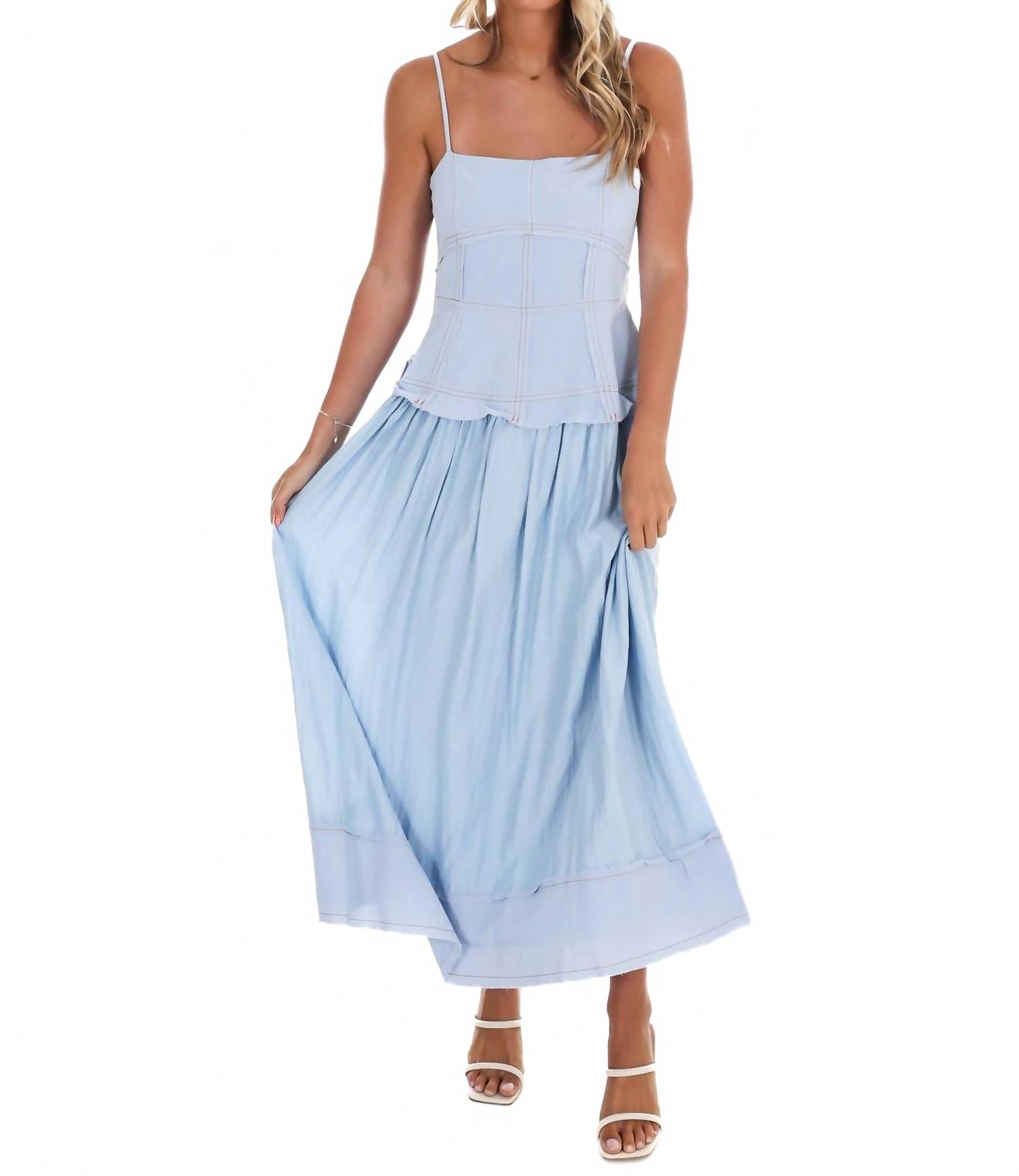 Платье идеальной длины существует. Представляем длинное миди-платье All Day Long от Umgee в светло-голубом цвете - шикарное дополнение к вашему гардеробу. Это платье на тонких бретельках и квадратном вырезе с облегающим корсетом в сочетании с пышной юбкой А-силуэта создает потрясающий силуэт. Застежка на пуговицы сзади добавляет элегантности, делая его идеальным для праздничных вечеринок. Высококачественная отделка обеспечит вам комфорт и стильный вид в течение всего дня.