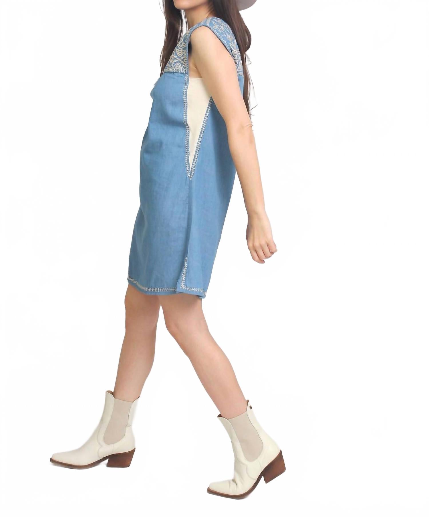 Идеальное мини-платье для теплых месяцев. Представляем платье Lyla Vintage Inspired от THML - очаровательное дополнение к любому гардеробу. Это платье-трапеция без рукавов цвета денима украшено изысканной вышивкой спереди и сзади, а также частично застегивается на пуговицы для удобства ношения. Изготовлено из 100% хлопка, с эффектными контрастными вставками по бокам, которые придают ему особый шарм. Уход: ручная стирка или химчистка, чтобы сохранить его в стиле бохо-шик.