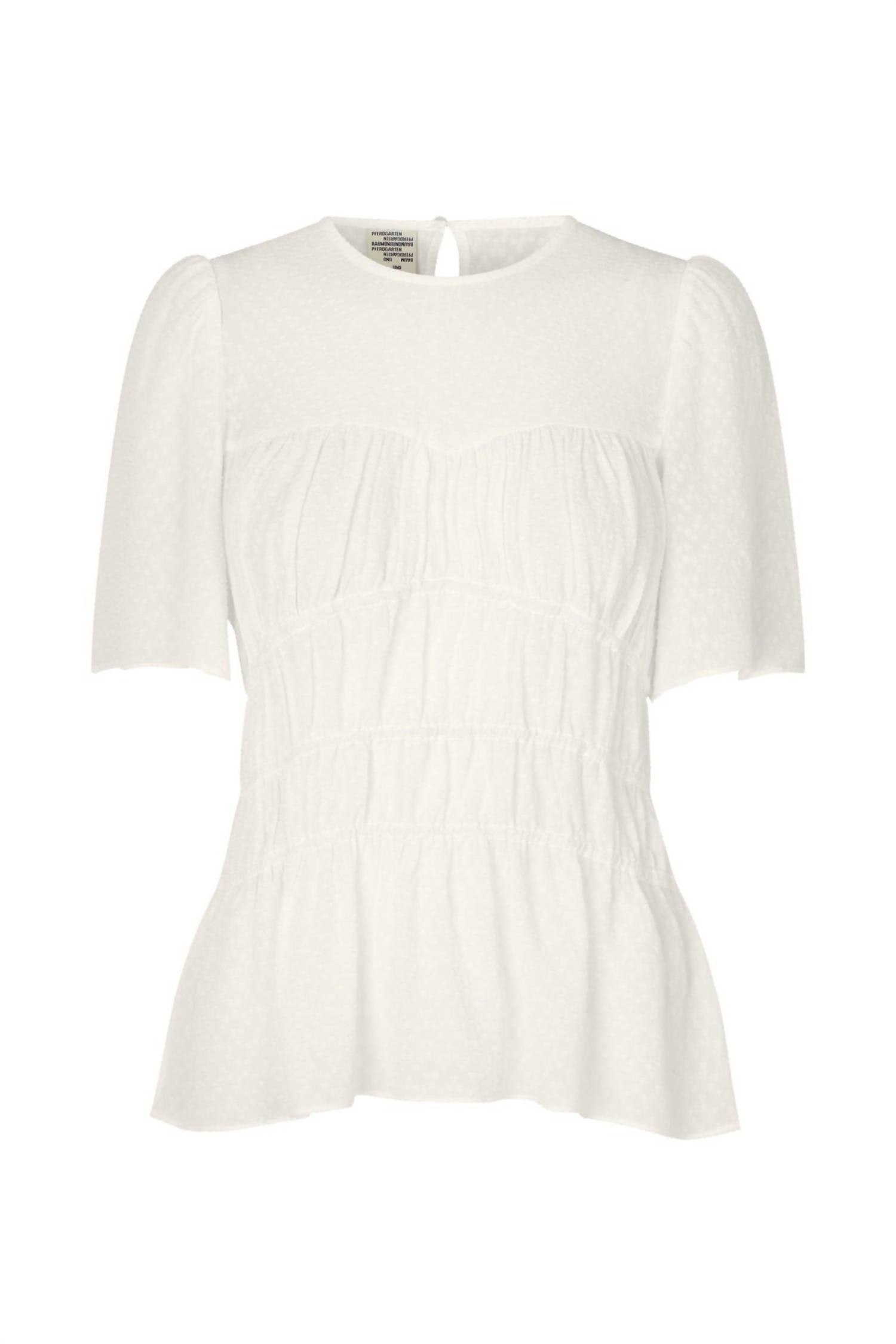 Откройте для себя блузку Marilu от Baum und Pferdgarten - полупрозрачную женственную модель, идеально подходящую для летнего ужина. Эта однотонная белая блузка с короткими рукавами и круглым вырезом горловины навевает атмосферу 90-х. Изготовленная из 100% вискозы, она имеет эластичный корпус и застежку на пуговицы сзади. Добавьте изысканности своему образу с этим эффектным дополнением к гардеробу.