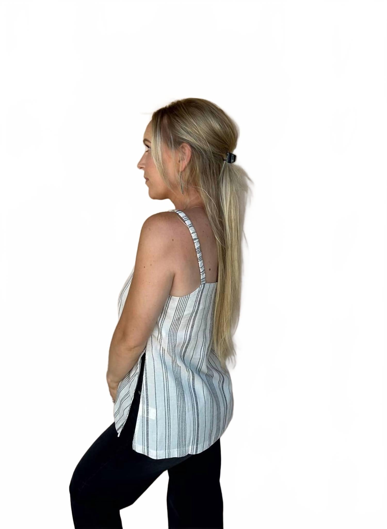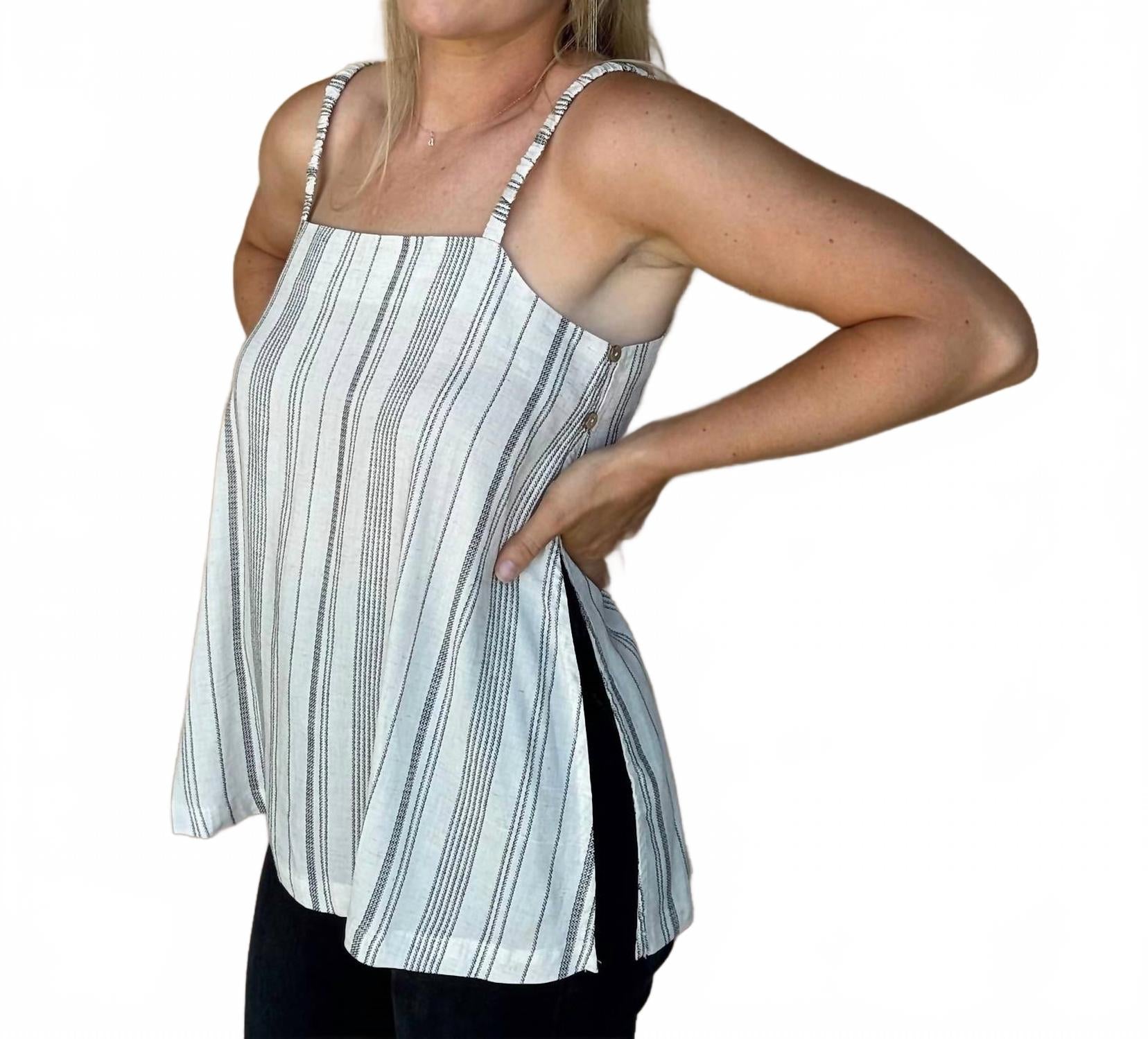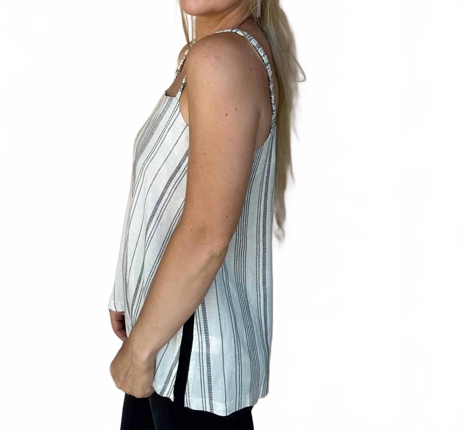 Эта полосатая майка, стильная и дышащая, выполнена из легкой льняной ткани с легким фактурным рисунком. Свободный А-образный силуэт с боковыми разрезами обеспечивает свободу движений и выгодно подчеркивает фигуру. Широкие лямки обеспечивают комфортную защиту, сохраняя при этом минималистичный вид, идеально подходящий для многослойного ношения в теплую погоду.