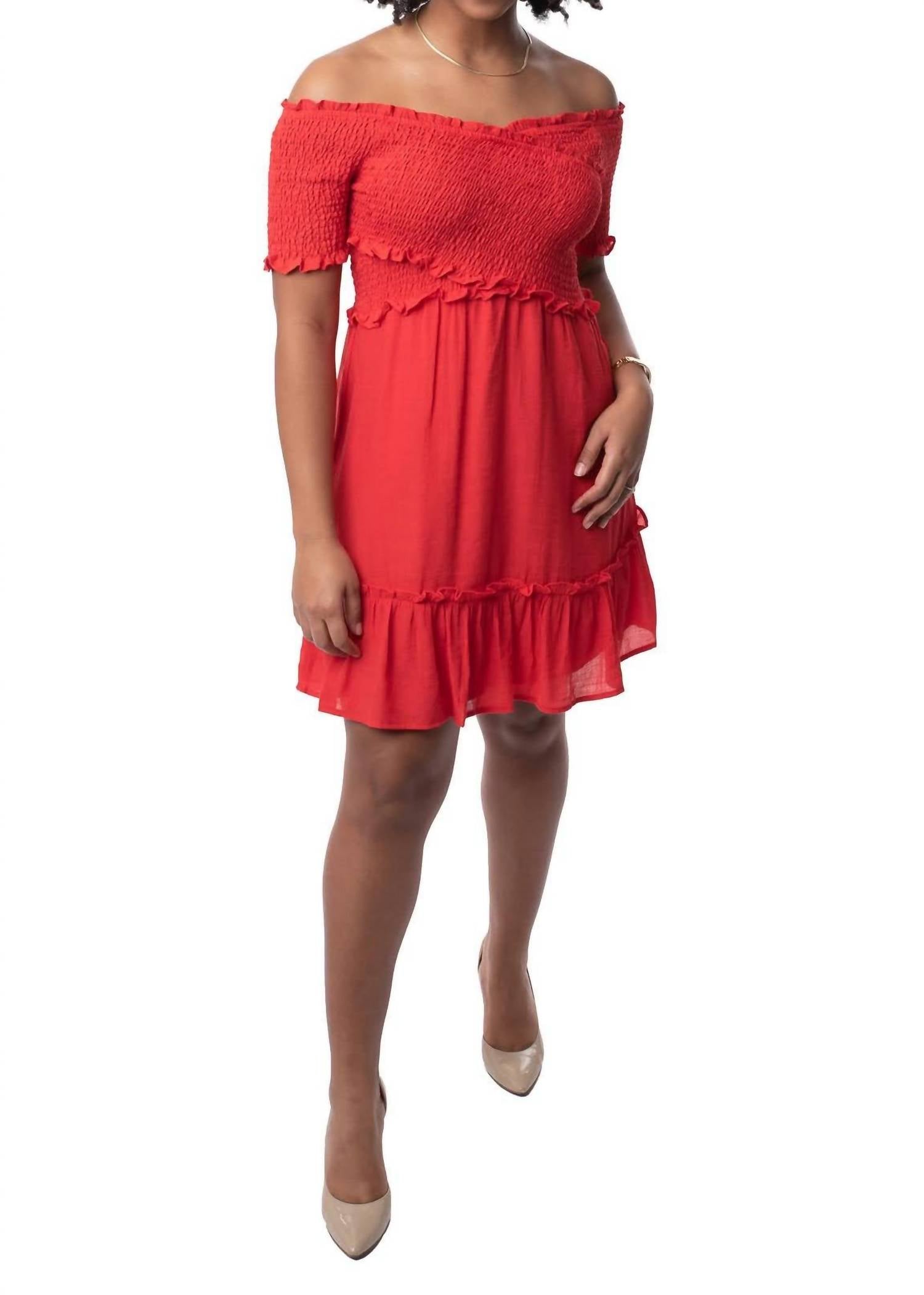 Короткое и воздушное платье для теплых дней. Представляем романтическое платье с оборками от Peach Love - эффектный выбор в ярко-красном цвете, идеально подходящий для свиданий и торжественных мероприятий. Это мини-платье облегающего силуэта с открытыми плечами, присборенным вырезом и рукавами без бретелек обеспечивает свободу движений и комфорт. Платье выполнено на подкладке из струящегося неэластичного материала, что подчеркивает его текстуру. Застежка - на застежку.