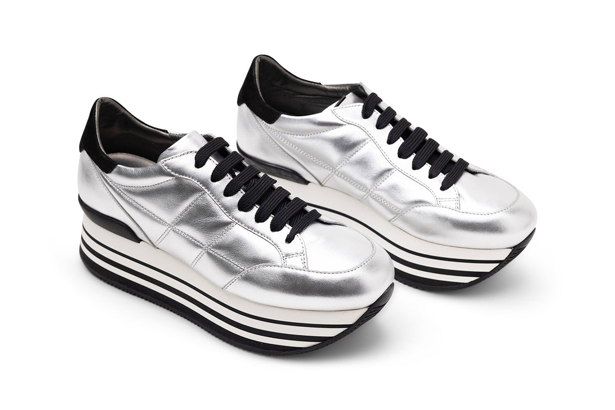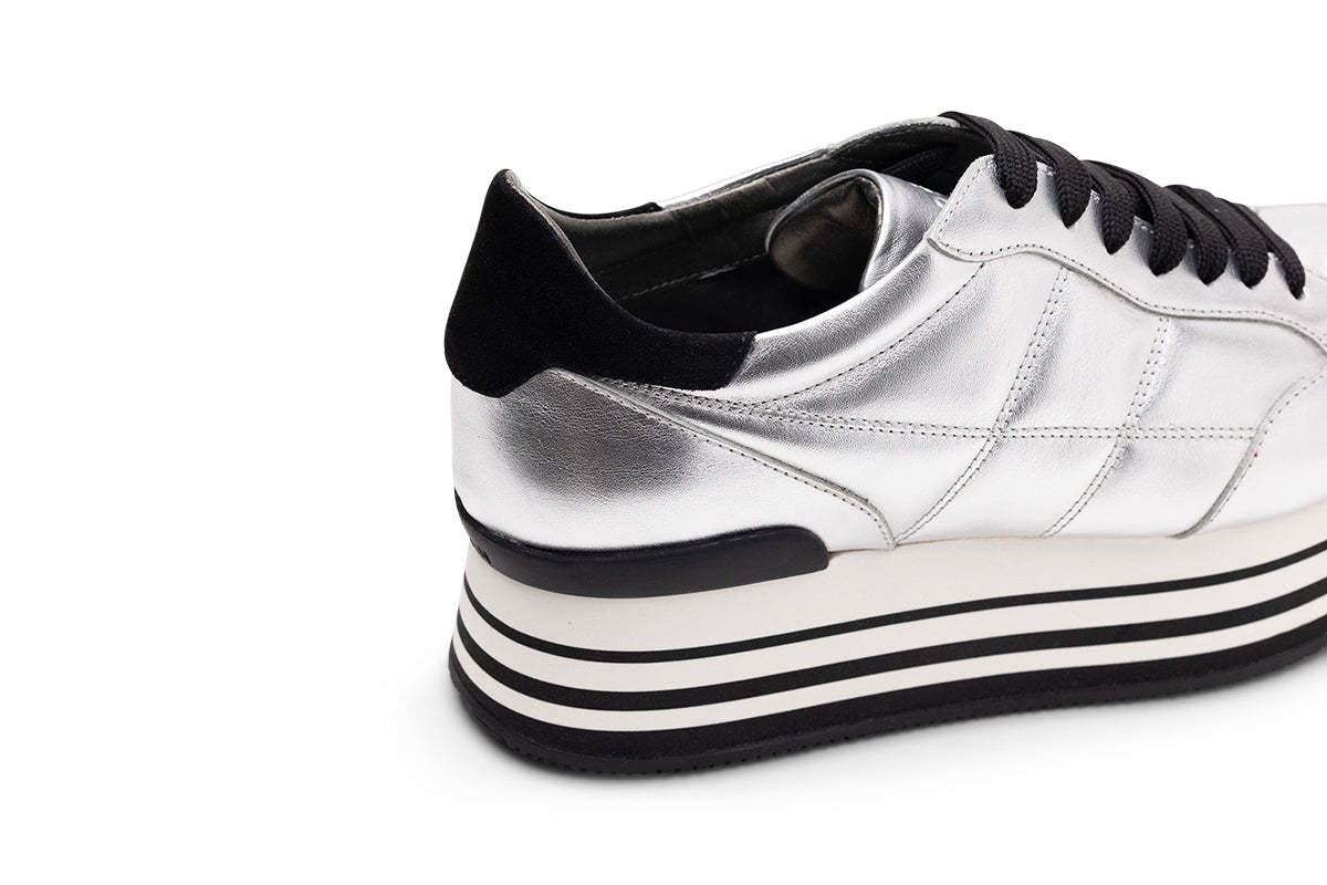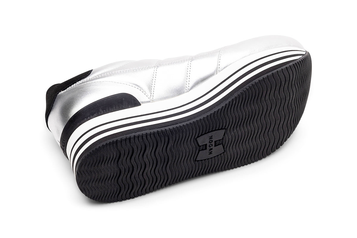 Кроссовки Hogan Maxi 222 Silver Leather выполнены в элегантном сочетании серебристой и черной кожи. Эти кроссовки на шнуровке создают современный непринужденный образ, обеспечивая комфорт и стиль, что делает их идеальным выбором на каждый день.