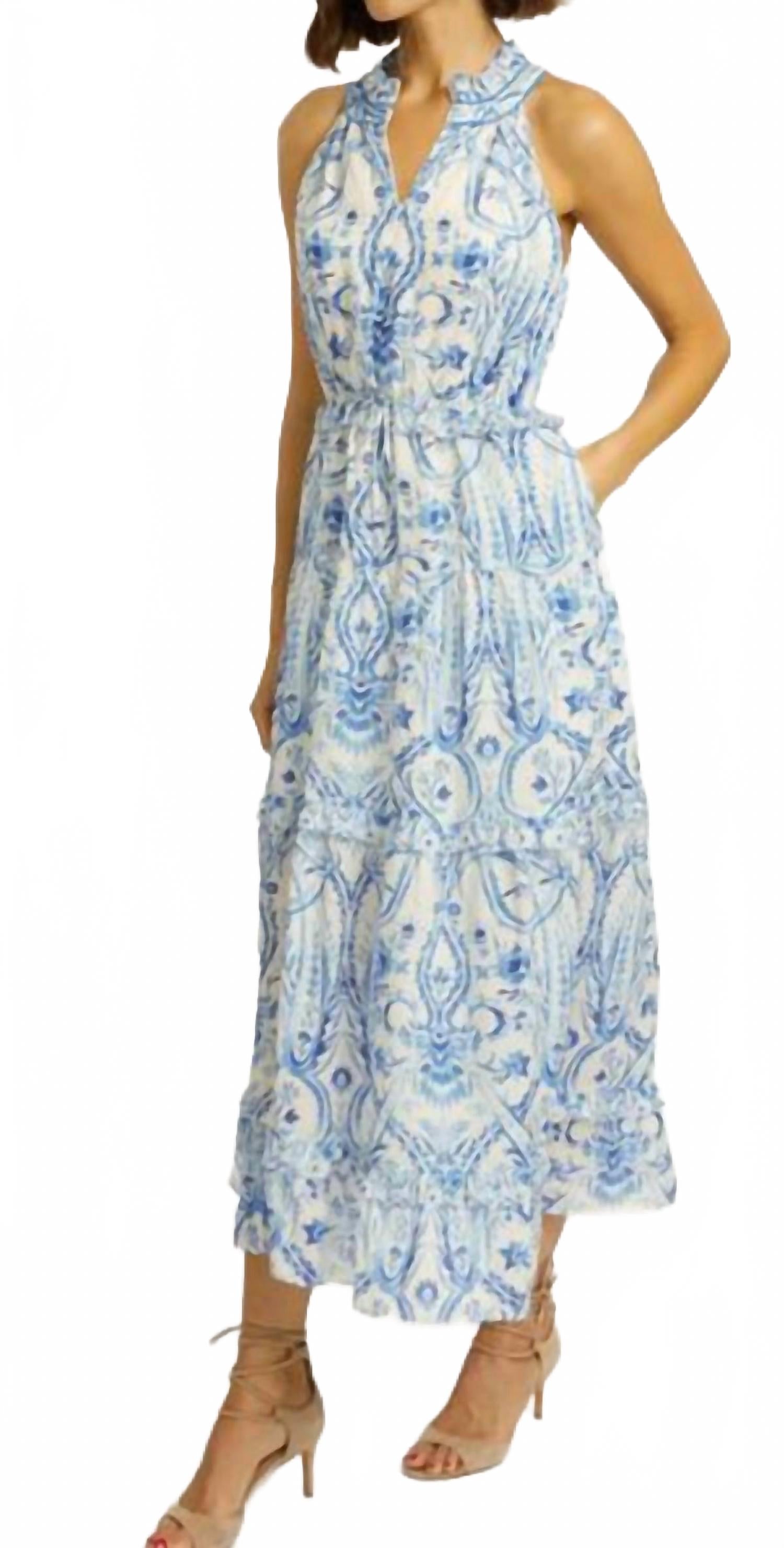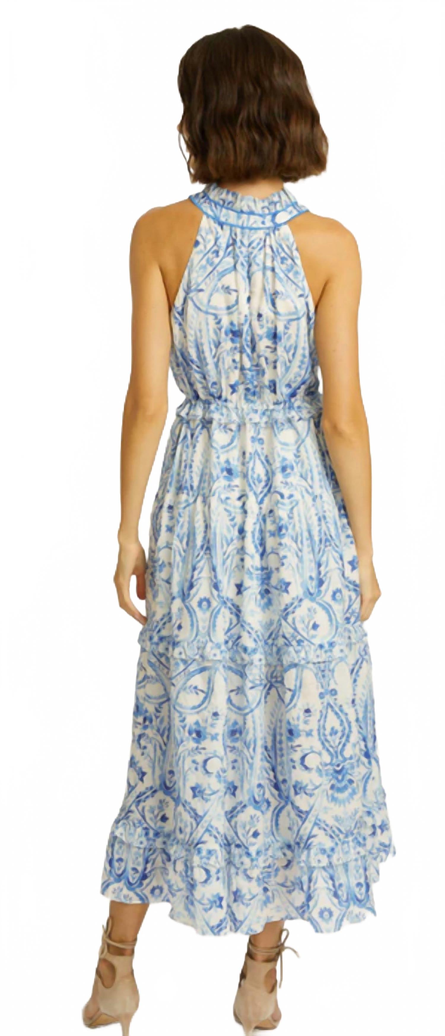 Это элегантное платье сочетает в себе непринужденный стиль и игривые детали. Оно имеет вырез халтер, отделанный изящной оборкой, и потайную молнию спереди. Длинный многоярусный силуэт обеспечивает грациозность движений, а оборки на талии и вдоль каждого яруса добавляют текстуру и очарование. Легкое и воздушное, оно идеально подходит для теплой погоды, сочетая комфорт и изысканность.