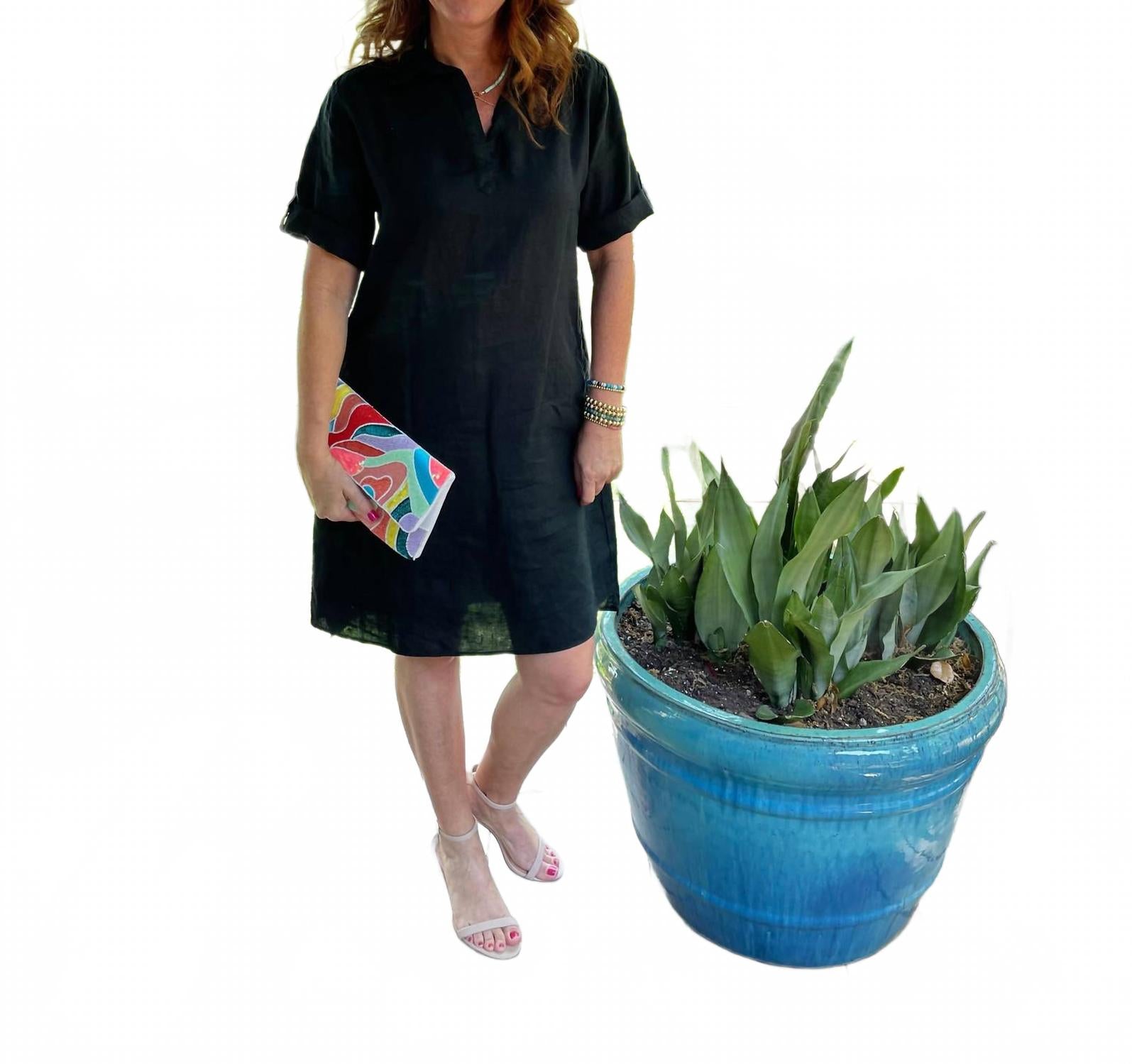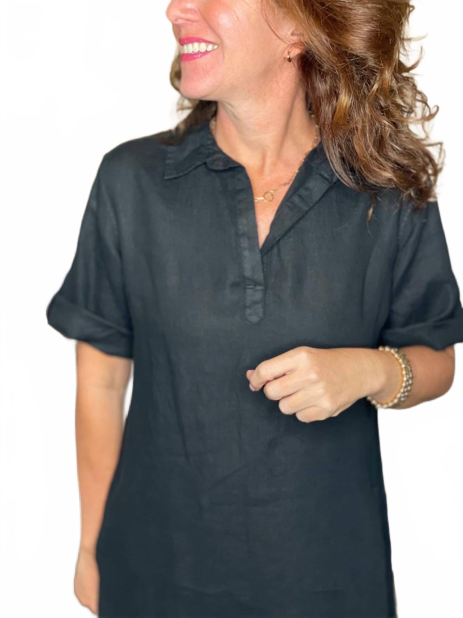 Льняное мини-платье Pure Amici - вневременное дополнение к любому гардеробу, идеально подходящее для Дня благодарения или летнего отпуска. Это платье-рубашка из 100% льна с короткими закатанными рукавами и практичными карманами универсального однотонного черного цвета. Застежка-липучка обеспечивает легкость и комфорт, а для легкого ухода можно стирать в стиральной машине. Модель Кэтлин ростом 160 см носит размер S.