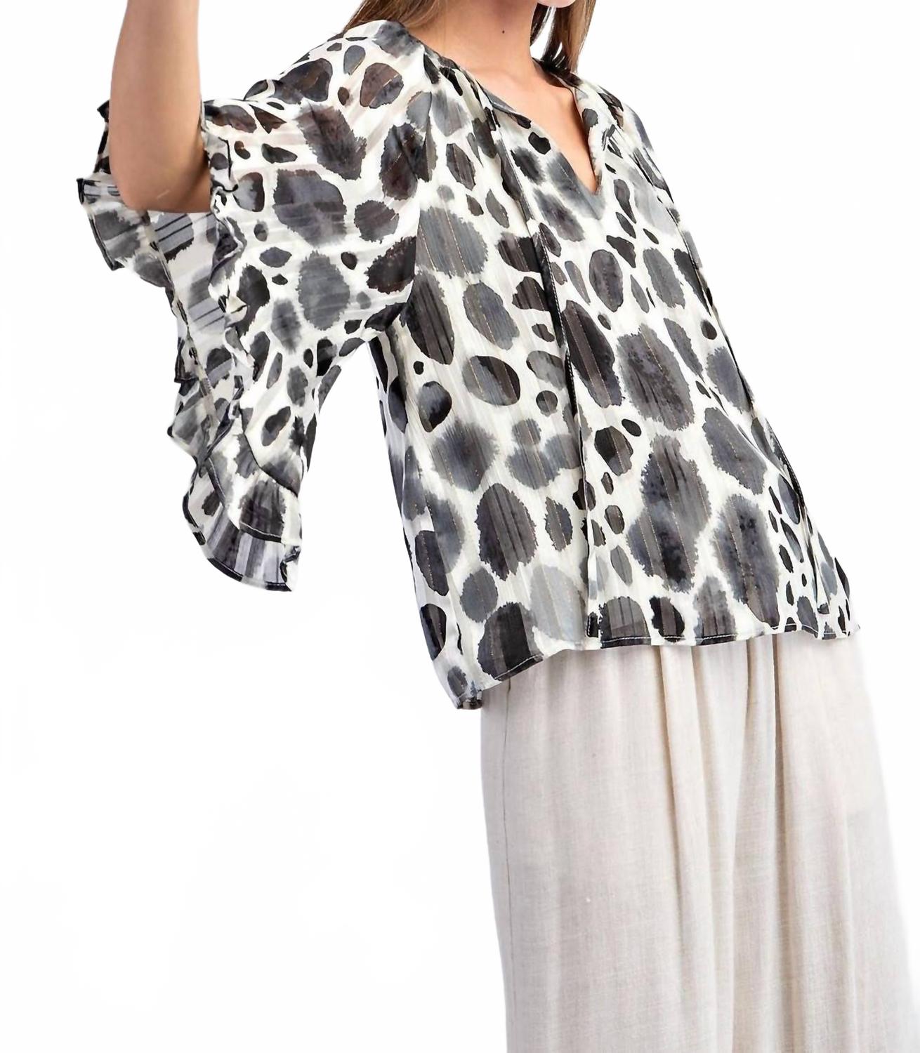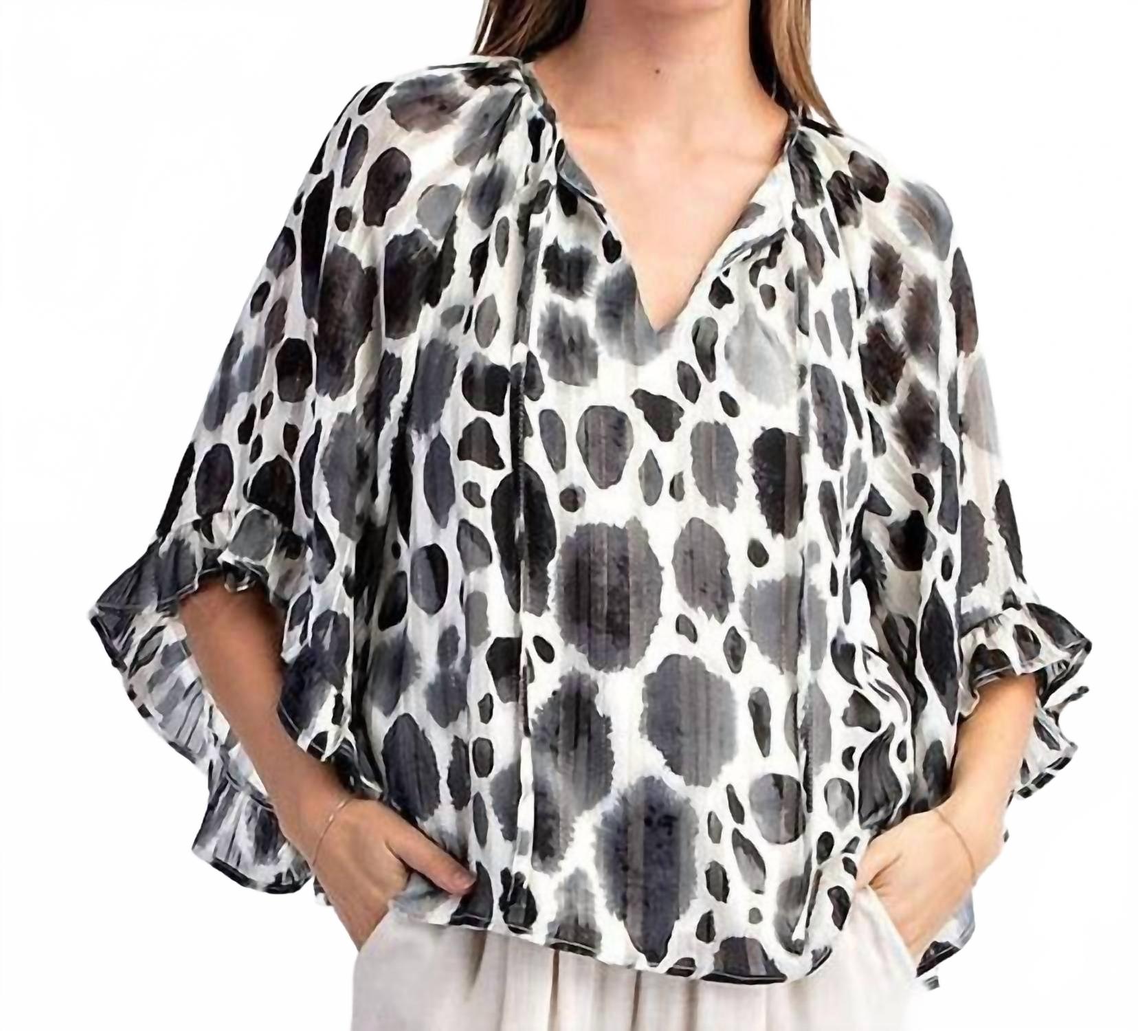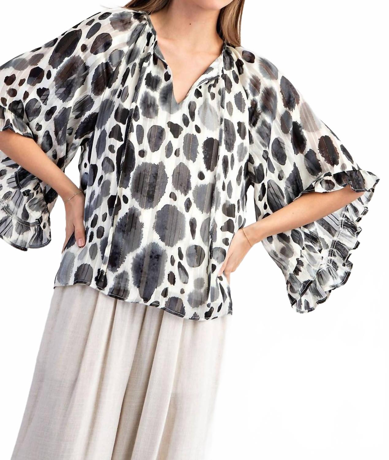Блузка в стиле «все в моде», которая никогда не выйдет из моды. Представляем блузку с коротким рукавом в горошек от ee-some - шикарный выбор для любого весеннего случая. Эта женская блузка с рукавами-колокольчиками до локтя и оборками, стильным круглым вырезом, дополненным завязкой спереди, создающей очаровательный эффект «замочной скважины». Изготовлена ​​из 100% полиэстера с роскошным люрексом и представлена ​​в классическом черном цвете. Застежка - на застежку.