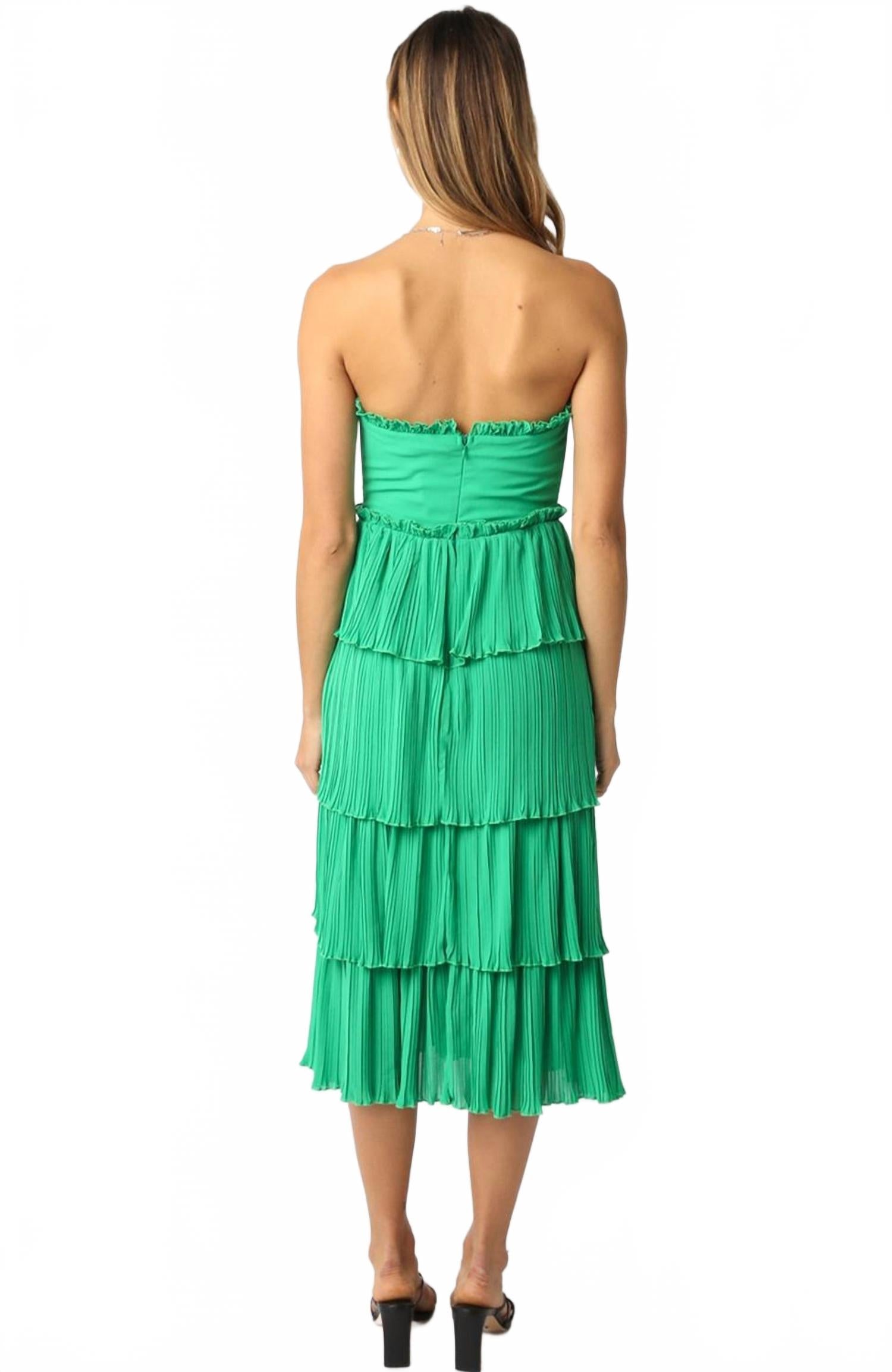Просто добавьте шлепанцы или мюли, и все готово. Представляем платье миди Lyla без бретелек с оборками от OLIVACEOUS - очаровательный выбор для вашего гардероба для отпуска. Оцените его облегающий силуэт с фактурными ярусами освежающего зеленого оттенка. Платье искусно сшито из 100% полиэстера и имеет потайную молнию сзади для безупречного кроя. Без бретелек и вырез сердечком создают очаровательный минималистичный образ, идеально подходящий для летних мероприятий.