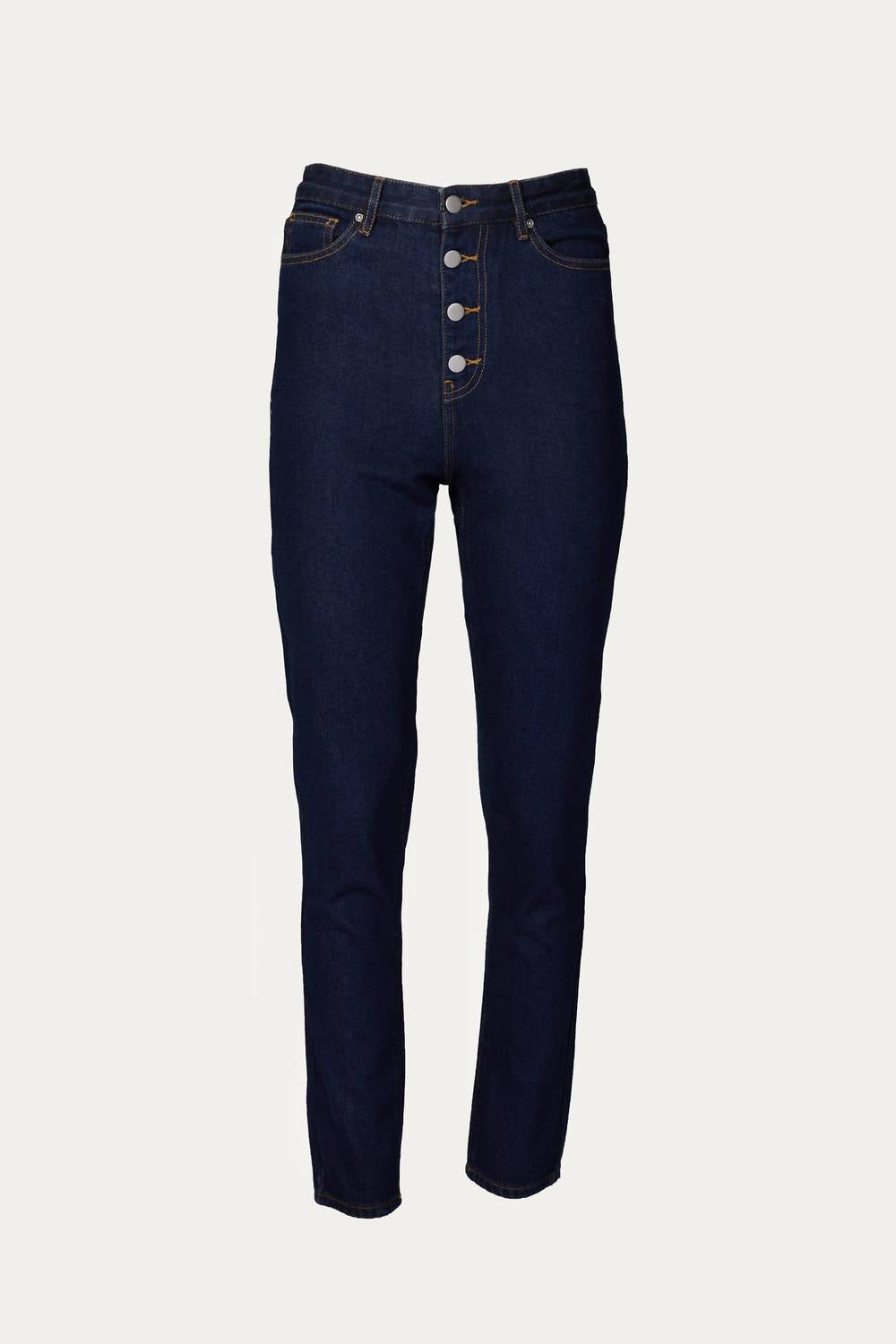 Джинсы с высокой посадкой и узкими штанинами. Удобный эластичный деним с карманами спереди и сзади, застежкой на пуговицу по центру спереди.