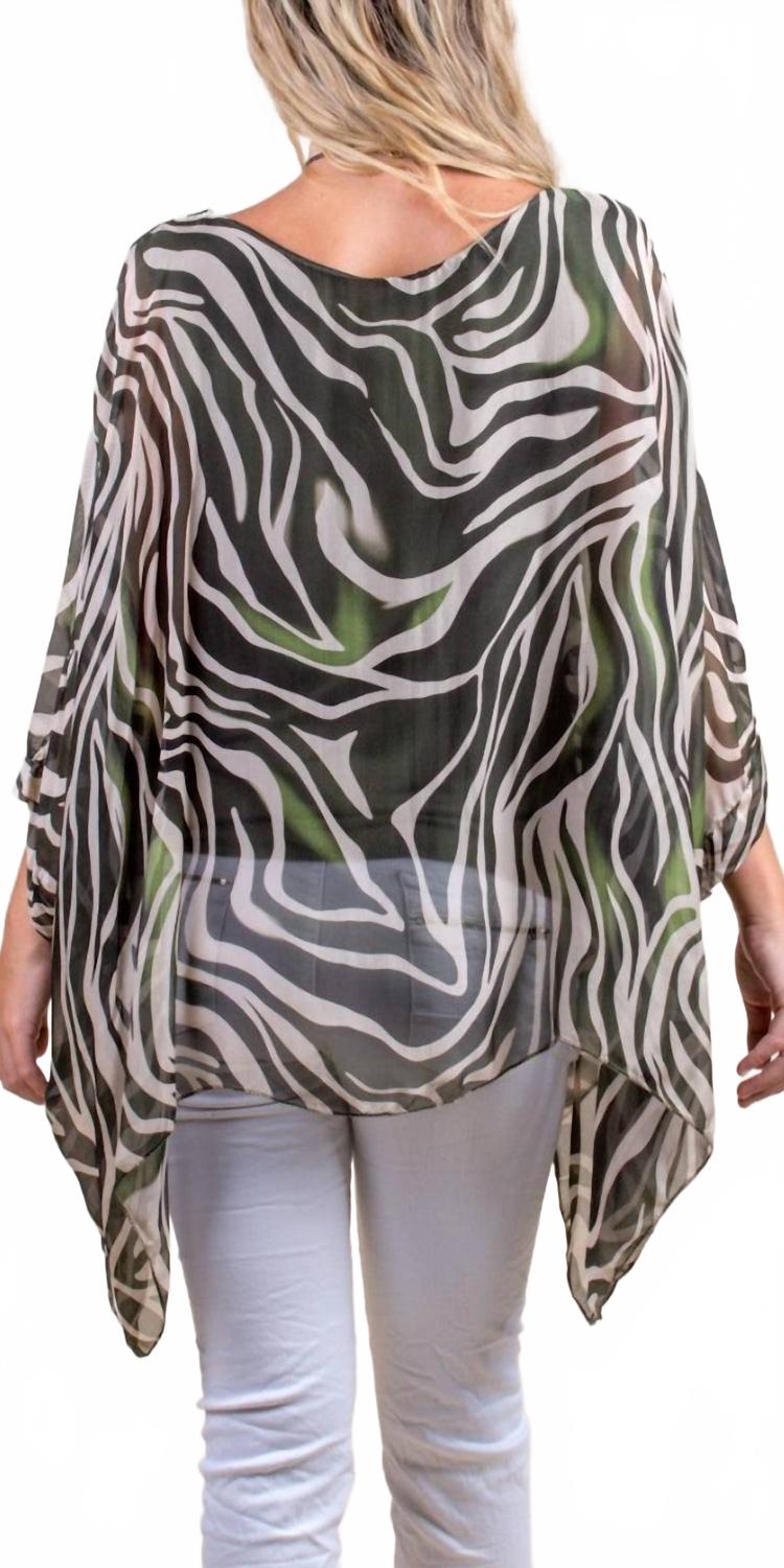 Стиль бохо-шик, идеально подходящий для праздничной вечеринки. Блузка из смесового шелка с рукавами три четверти и стильным волнистым низом украшена эффектным анималистичным принтом. Состав: 30% шелк, 70% вискоза (наружная часть) и 95% вискоза, 5% эластан (изнаночная часть). Сделано в Италии. Легко надевается. Легко стирать в стиральной машине. Подходит для размеров от XS до XL.