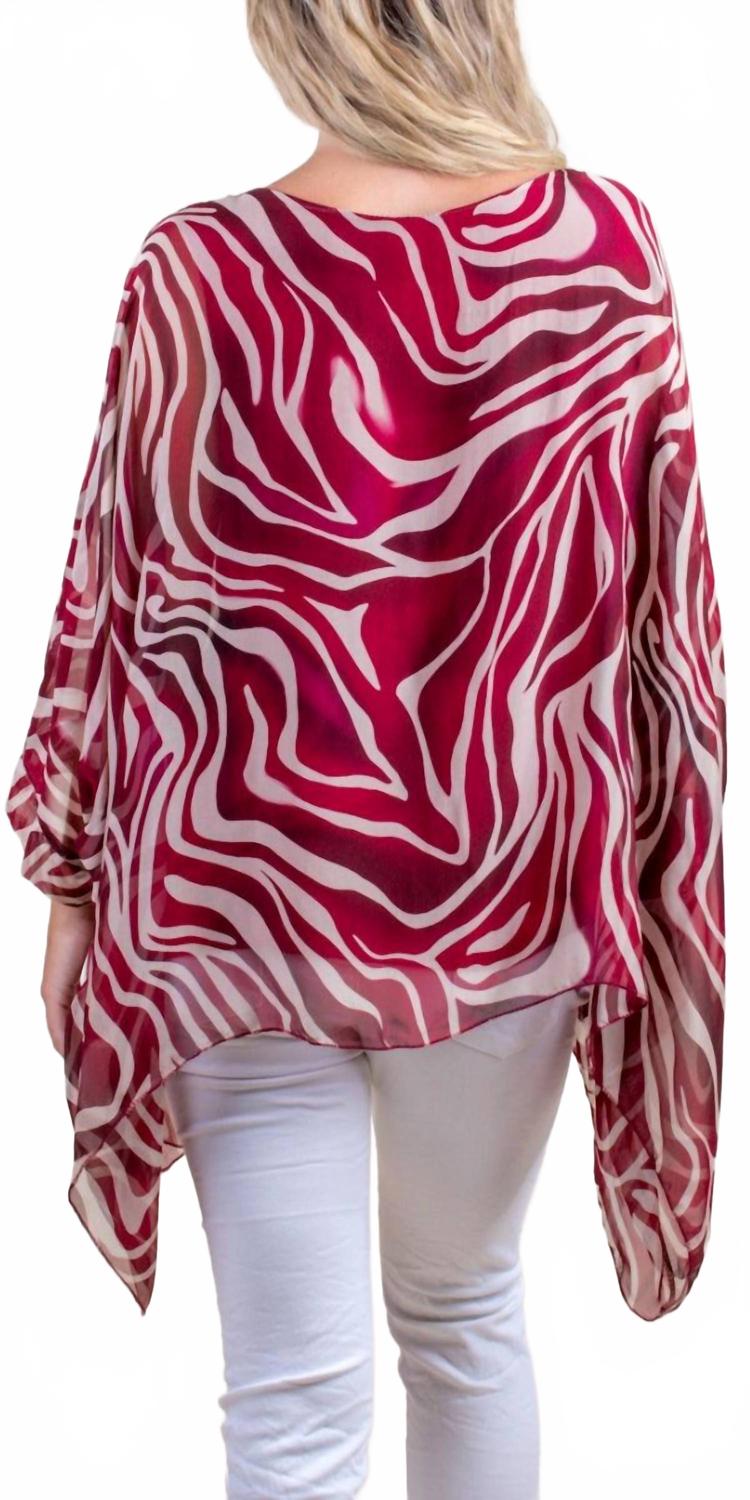 Стиль бохо-шик, идеально подходящий для праздничной вечеринки. Блузка из смесового шелка с рукавами три четверти и стильным волнистым низом украшена эффектным анималистичным принтом. Состав: 30% шелк, 70% вискоза (наружная часть) и 95% вискоза, 5% эластан (изнаночная часть). Сделано в Италии. Легко надевается. Легко стирать в стиральной машине. Подходит для размеров от XS до XL.