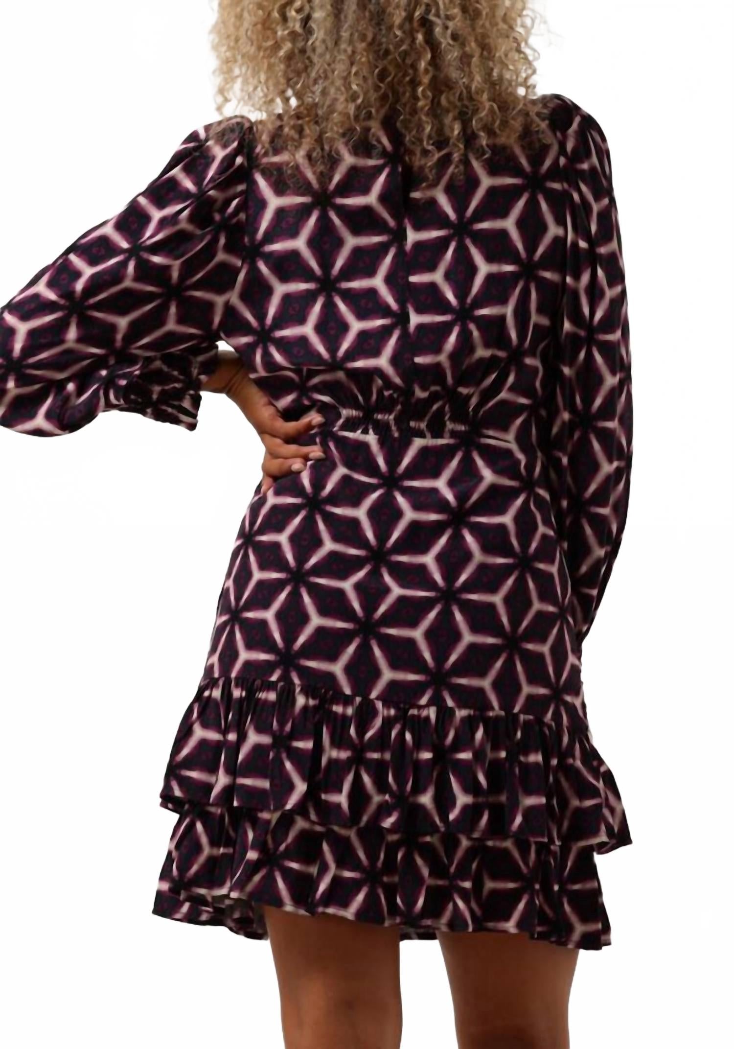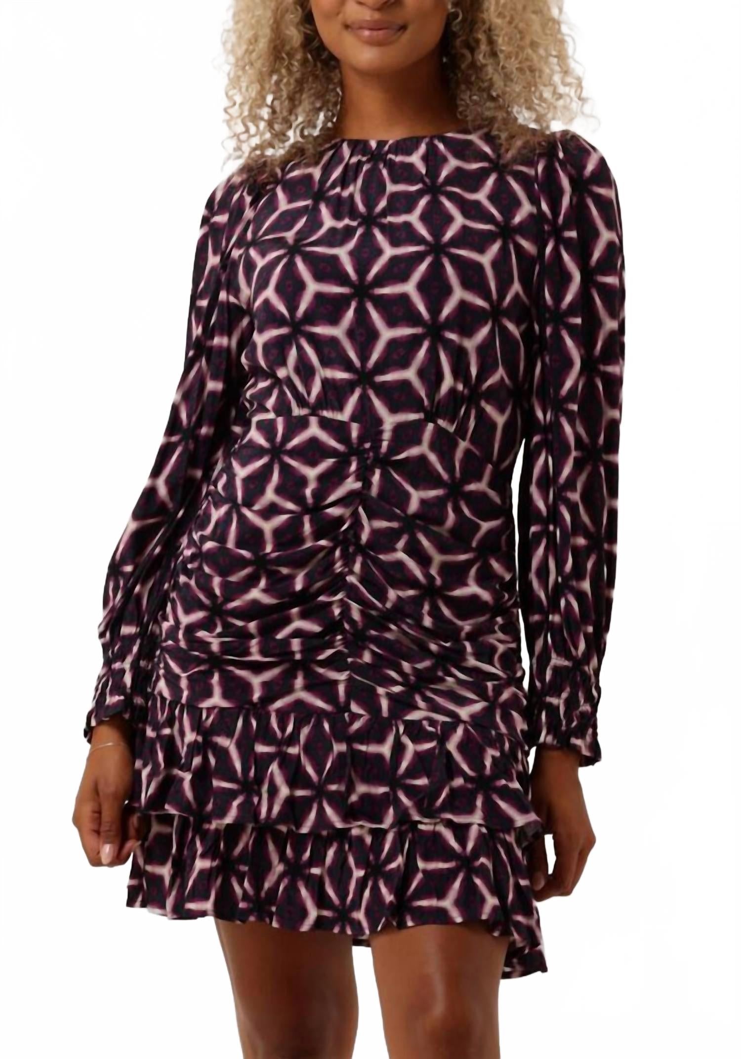 Комфортное и элегантное платье, которое вы будете носить круглый год. Представляем мини-платье Chama от Suncoo - шикарный А-силуэт, идеально подходящий для осенних вечерних мероприятий. Это платье с ярким геометрическим принтом фиолетового цвета, длинными рукавами и классическим круглым вырезом горловины создает минималистичный образ. Платье изготовлено из хлопка, обеспечивает комфорт и стиль. Застежка: надевать. Уход: машинная стирка и сушка в стиральной машине.