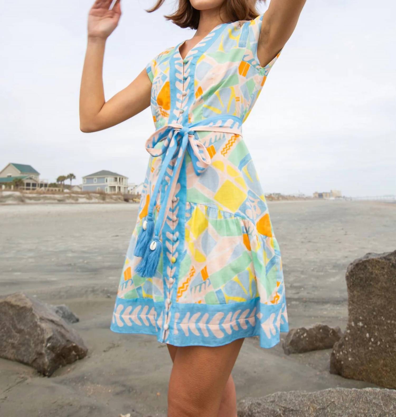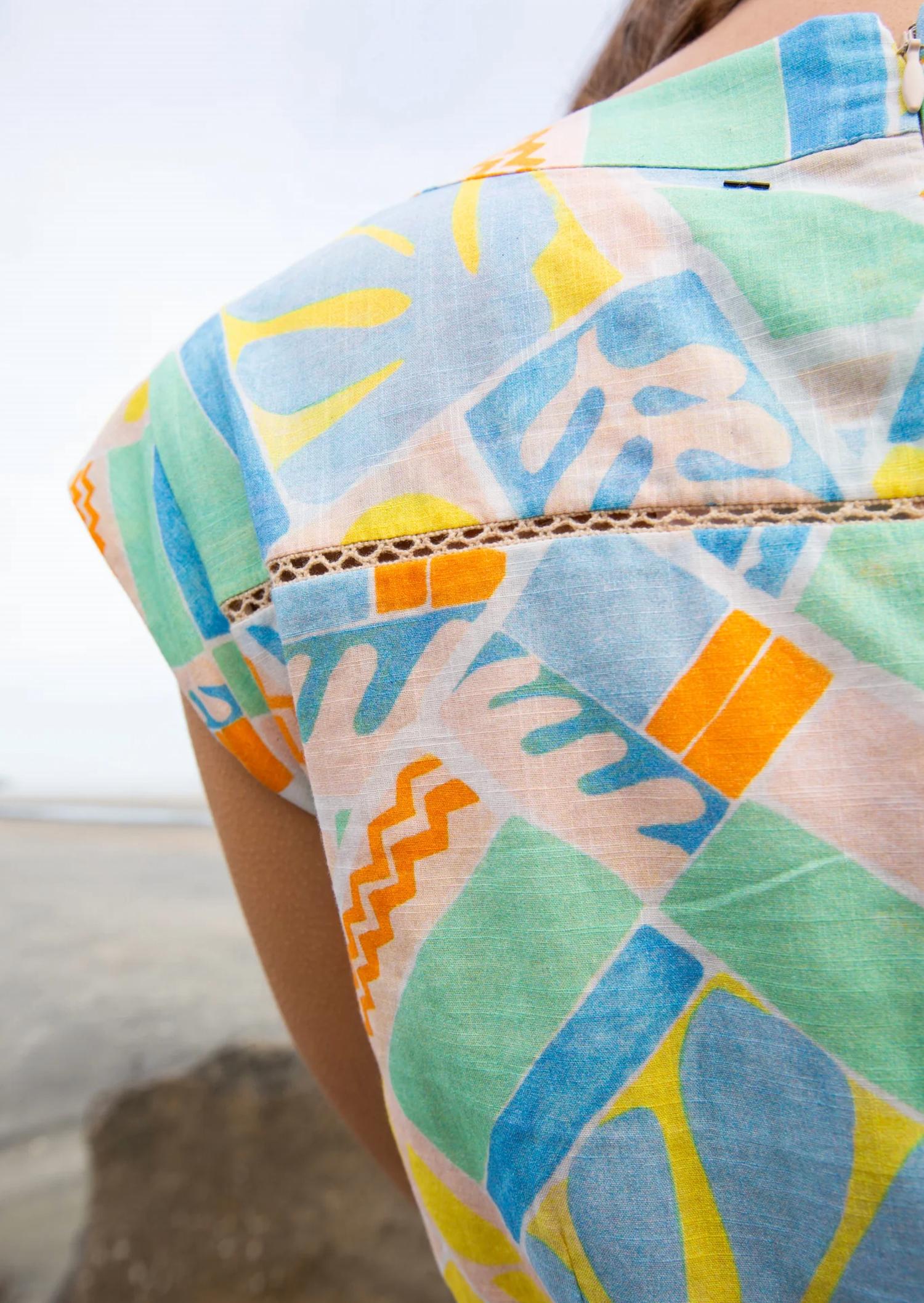 Короткое и воздушное платье для теплых дней. Встречайте платье Ruby от Anna Cate - идеальное сочетание игривого летнего стиля и изысканности. Это мини-платье А-силуэта с абстрактным геометрическим узором отличается короткими рукавами и привлекательным V-образным вырезом. Платье изготовлено из дышащего хлопка, имеет удобную застежку на пуговицы и изящные детали в виде ракушек. Идеально подходит для самых разных случаев и добавит яркости вашему сезонному гардеробу.