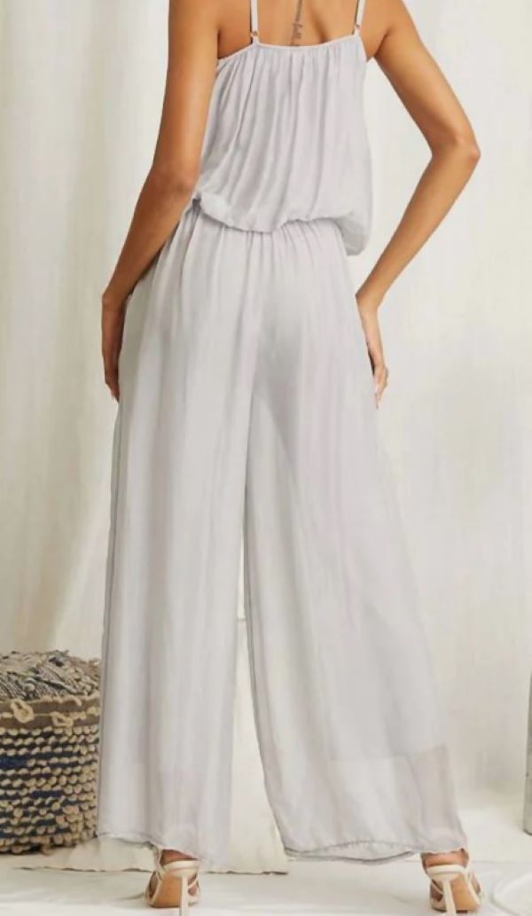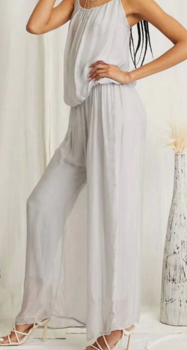 Этот комбинезон выглядит стильно и непринужденно, не нужно многого. Добавьте эффектные украшения, чтобы сделать его более нарядным, или наденьте кроссовки для более непринужденного образа. Элегантный серебристый комбинезон, сочетающий в себе комфорт и стиль. Регулируемые тонкие бретельки и легкий силуэт, который идеально подходит для любого типа фигуры. Изготовлен из 95% вискозы и 5% эластана. Эластичный пояс, широкие брюки и застежка на липучке. Свободный крой.