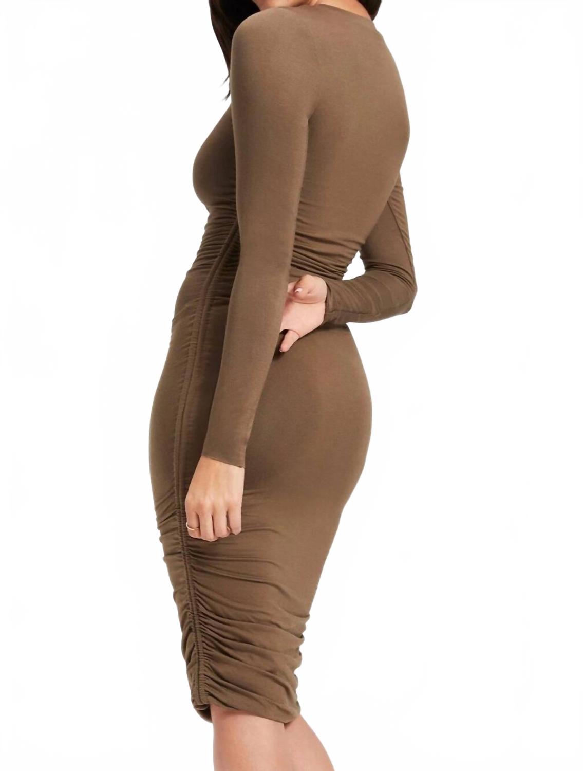 Свободное и элегантное платье, которое вы будете носить круглый год. Выбирайте стильное платье Slinky Ruched Dress от GOOD AMERICAN из мягкого джерси в шикарном оливковом цвете. Это облегающее мини-платье с длинными рукавами, длиной до колена и круглым вырезом, подчеркивающим фигуру. Застежка-липучка и элегантный однотонный крой делают его идеальным для минималистичного летнего образа. Идеально подходит для вечерних мероприятий или празднования Дня благодарения.