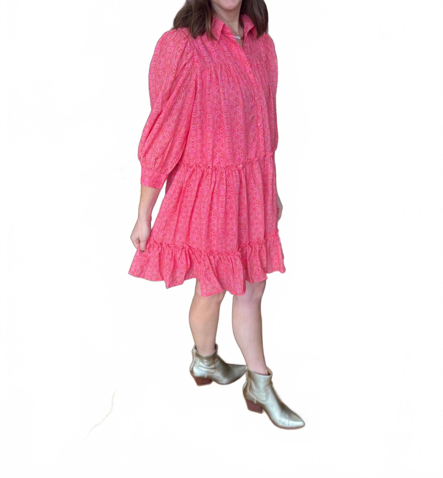 Вступите в новый сезон с платьем Remi Tribal Dress от Sincerely Ours - ярким образцом бохо-шика в розовом цвете с узором, идеально подходящим для Дня святого Валентина или отпуска. Это женское платье-трапеция с рукавами три четверти и элегантным воротником создает изысканный образ. Застежка: пуговицы. Идеальное весеннее платье - незаменимая вещь в любом модном гардеробе.
